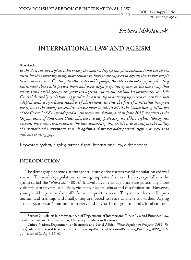 In the 21st century ageism is becoming the most widely spread phenomenon. It has become so extensive that presently many more seniors in Europe are exposed to ageism than other people to sexism or racism. Contrary to other vulnerable groups, the elderly do not enjoy any binding instrument that could protect them and their dignity against ageism in the same way that women and racial groups are protected against sexism and racism. Unfortunately, the UN General Assembly resolution, supposed to be a first step to drawing up such a convention, was adopted with a significant number of abstentions, leaving the fate of a potential treaty on the rights of the elderly uncertain. On the other hand, in 2014 the Committee of Ministers of the Council of Europe adopted a new recommendation, and in June 2015 members of the Organisation of American States adopted a treaty protecting the elder’s rights. Taking into account these new circumstances, the idea underlying this article is to investigate the ability of international instruments to limit ageism and protect older persons’ dignity, as well as to indicate existing gaps.