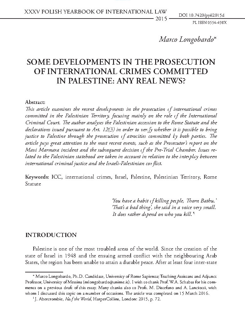 - Spagnolo A., La posizione del Procuratore della Corte Penale Internazionale nei confronti della dichiarazione dell’Autorità nazionale palestinese di voler accettare la giurisdizione della Corte [The ICC Prosecutor and the Palestinian Declaration of acceptance of the ICC jurisdiction], “La Comunità Internazionale” 2012, vol. 67, no. 3–4, pp. 613–621.