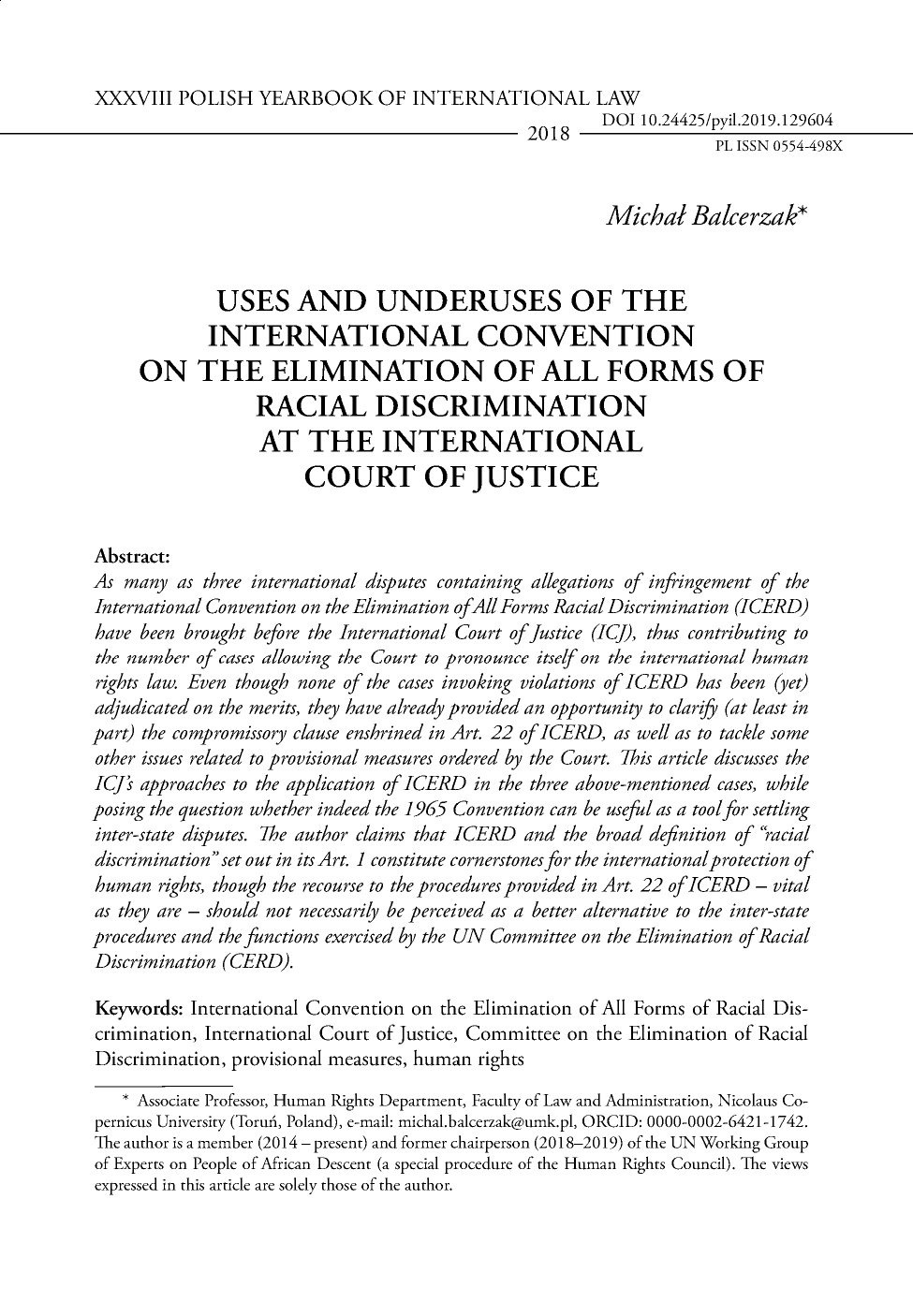 As many as three international disputes containing allegations of infringement of the International Convention on the Elimination of All Forms Racial Discrimination (ICERD) have been brought before the International Court of Justice (ICJ), thus contributing to the number of cases allowing the Court to pronounce itself on the international human rights law. Even though none of the cases invoking violations of ICERD has been (yet) adjudicated on the merits, they have already provided an opportunity to clarify (at least in part) the compromissory clause enshrined in Art. 22 of ICERD, as well as to tackle some other issues related to provisional measures ordered by the Court. This article discusses the ICJ’s approaches to the application of ICERD in the three above-mentioned cases, while posing the question whether indeed the 1965 Convention can be useful as a tool for settling inter-state disputes. The author claims that ICERD and the broad definition of “racial discrimination” set out in its Art. 1 constitute cornerstones for the international protection of human rights, though the recourse to the procedures provided in Art. 22 of ICERD – vital as they are – should not necessarily be perceived as a better alternative to the inter-state procedures and the functions exercised by the UN Committee on the Elimination of Racial Discrimination (CERD).