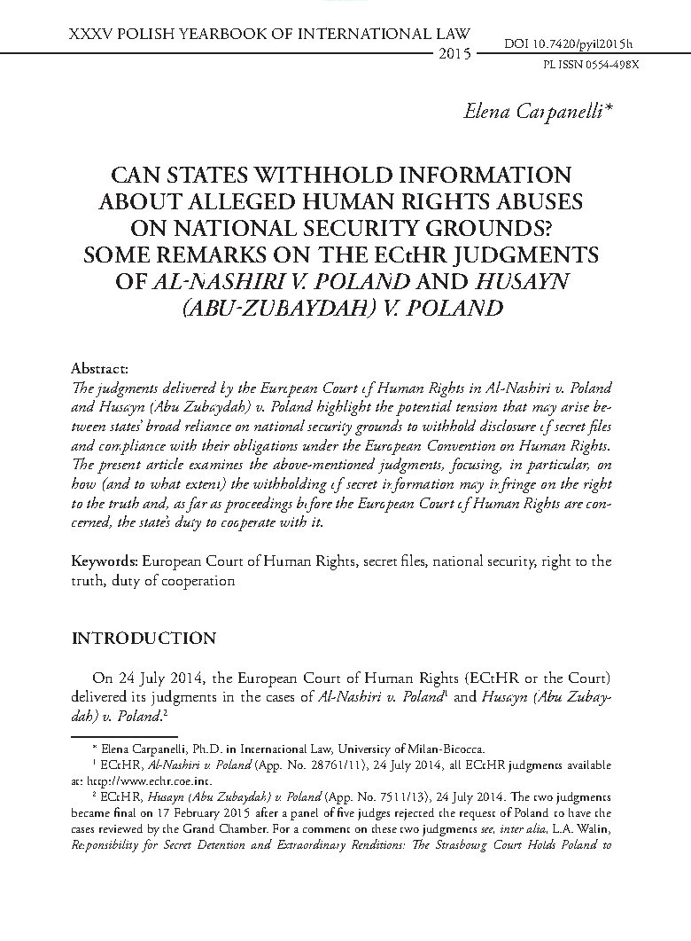 The judgments delivered by the European Court of Human Rights in Al-Nashiri v. Poland and Husayn (Abu Zubaydah) v. Poland highlight the potential tension that may arise between states’ broad reliance on national security grounds to withhold disclosure of secret files and compliance with their obligations under the European Convention on Human Rights. The present article examines the above-mentioned judgments, focusing, in particular, on how (and to what extent) the withholding of secret information may infringe on the right to the truth and, as far as proceedings before the European Court of Human Rights are concerned, the state’s duty to cooperate with it.