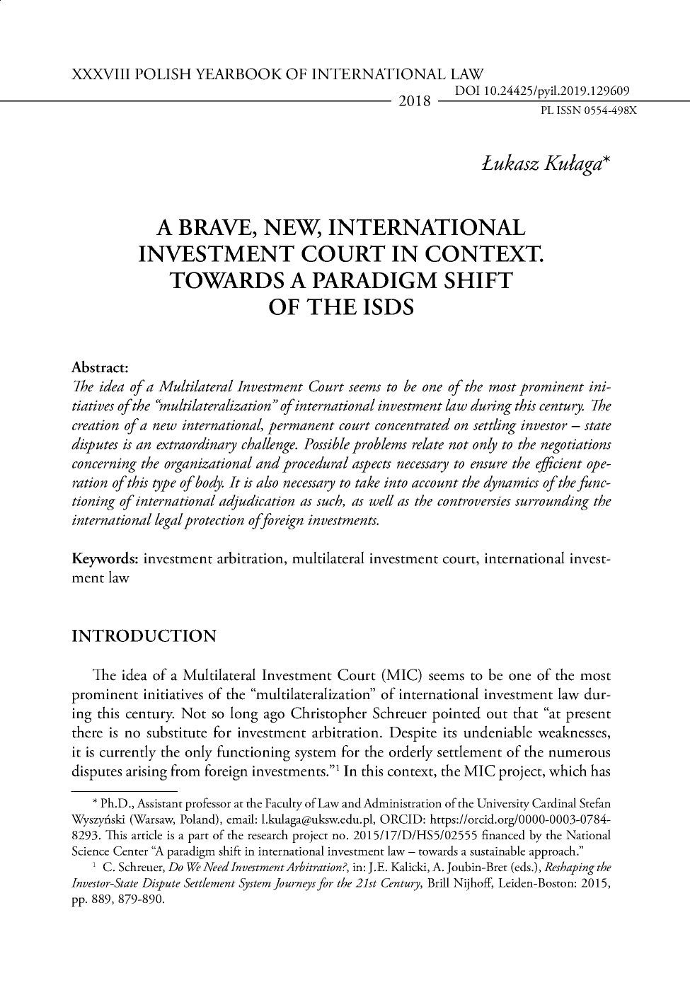 The idea of a Multilateral Investment Court seems to be one of the most prominent initiatives of the “multilateralization” of international investment law during this century. The creation of a new international, permanent court concentrated on settling investor – state disputes is an extraordinary challenge. Possible problems relate not only to the negotiations concerning the organizational and procedural aspects necessary to ensure the efficient operation of this type of body. It is also necessary to take into account the dynamics of the functioning of international adjudication as such, as well as the controversies surrounding the international legal protection of foreign investments.