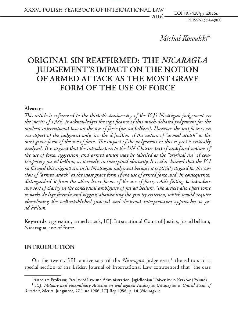 This article is referenced to the thirtieth anniversary of the ICJ’s Nicaragua judgement on the merits of 1986. It acknowledges the significance of this much-debated judgement for the modern international law on the use of force (jus ad bellum). However the text focuses on one aspect of the judgment only, i.e. the definition of the notion of “armed attack” as the most grave form of the use of force. The impact of the judgement in this respect is critically analysed. It is argued that the introduction to the UN Charter text of undefined notions of the use of force, aggression, and armed attack may be labelled as the “original sin” of contemporary jus ad bellum, as it results in conceptual obscurity. It is also claimed that the ICJ reaffirmed this original sin in its Nicaragua judgment because it explicitly argued for the notion of “armed attack” as the most grave form of the use of armed force and, in consequence, distinguished it from the other, lesser forms of the use of force, while failing to introduce any sort of clarity in the conceptual ambiguity of jus ad bellum. The article also offers some remarks de lege ferenda and suggests abandoning the gravity criterion, which would require abandoning the well-established judicial and doctrinal interpretation approaches to jus ad bellum.