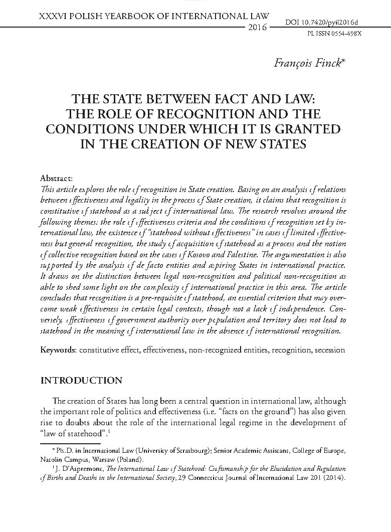This article explores the role of recognition in State creation. Basing on an analysis of relations between effectiveness and legality in the process of State creation, it claims that recognition is constitutive of statehood as a subject of international law. The research revolves around the following themes: the role of effectiveness criteria and the conditions of recognition set by international law, the existence of “statehood without effectiveness” in cases of limited effectiveness but general recognition, the study of acquisition of statehood as a process and the notion of collective recognition based on the cases of Kosovo and Palestine. The argumentation is also supported by the analysis of de facto entities and aspiring States in international practice. It draws on the distinction between legal non-recognition and political non-recognition as able to shed some light on the complexity of international practice in this area. The article concludes that recognition is a pre-requisite of statehood, an essential criterion that may overcome weak effectiveness in certain legal contexts, though not a lack of independence. Conversely, effectiveness of government authority over population and territory does not lead to statehood in the meaning of international law in the absence of international recognition.
