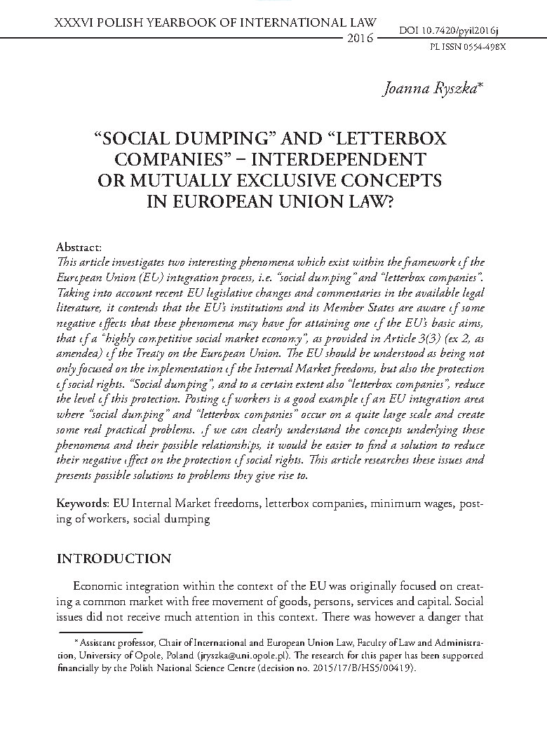 This article investigates two interesting phenomena which exist within the framework of the European Union (EU) integration process, i.e. “social dumping” and “letterbox companies”. Taking into account recent EU legislative changes and commentaries in the available legal literature, it contends that the EU’s institutions and its Member States are aware of some negative effects that these phenomena may have for attaining one of the EU’s basic aims, that of a “highly competitive social market economy”, as provided in Article 3(3) (ex 2, as amended) of the Treaty on the European Union. The EU should be understood as being not only focused on the implementation of the Internal Market freedoms, but also the protection of social rights. “Social dumping”, and to a certain extent also “letterbox companies”, reduce the level of this protection. Posting of workers is a good example of an EU integration area where “social dumping” and “letterbox companies” occur on a quite large scale and create some real practical problems. If we can clearly understand the concepts underlying these phenomena and their possible relationships, it would be easier to find a solution to reduce their negative effect on the protection of social rights. This article researches these issues and presents possible solutions to problems they give rise to.