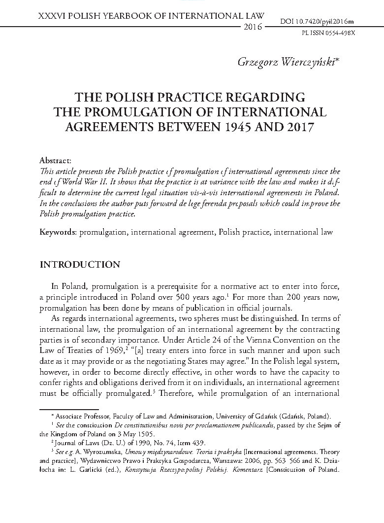This article presents the Polish practice of promulgation of international agreements since the end of World War II. It shows that the practice is at variance with the law and makes it difficult to determine the current legal situation vis-à-vis international agreements in Poland. In the conclusions the author puts forward de lege ferenda proposals which could improve the Polish promulgation practice.
