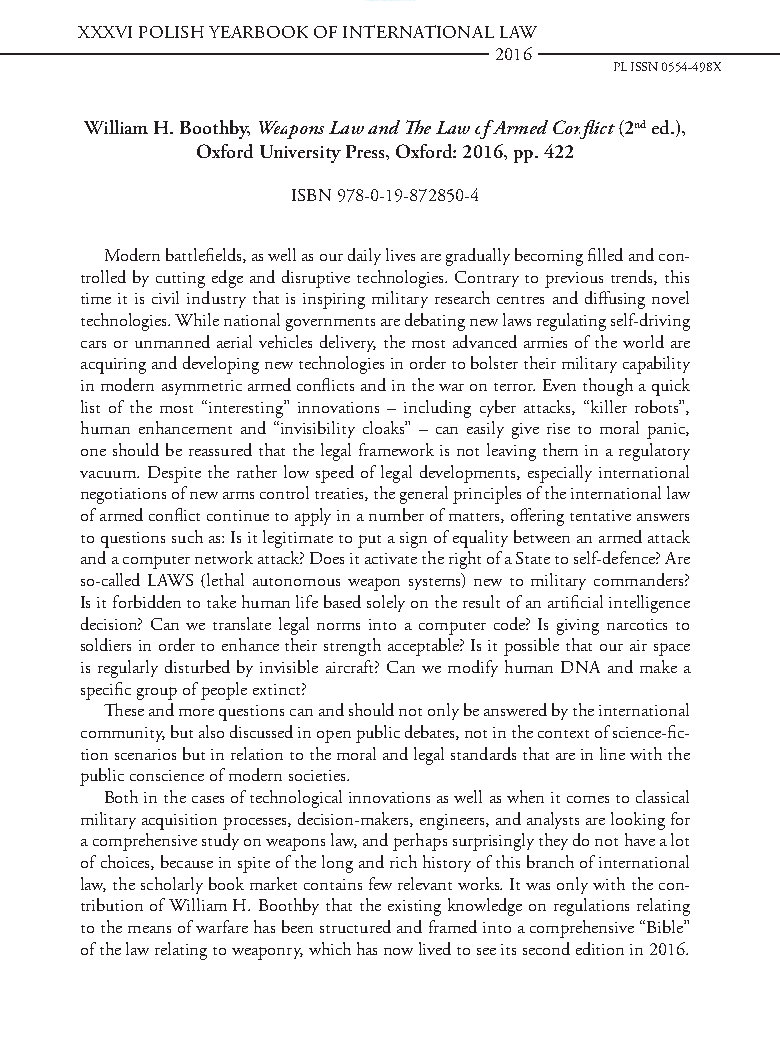 Vol. 36 (2016) Book reviews William H. Boothby, Weapons Law and The Law of Armed Conflict (2nd ed.), Oxford University Press, Oxford: 2016, pp. 422 PDF Kaja Kowalczewska more info Kaja Kowalczewska Jagiellonian University in Kraków Published 2016-12-31 Copyright (c) 2021 ILS PAS This work is licensed under a Creative Commons Attribution 4.0 International License. How to Cite William H. Boothby, Weapons Law and The Law of Armed Conflict (2nd ed.), Oxford University Press, Oxford: 2016, pp. 422. (2016). Polish Yearbook of International Law, 36, 279-282. https://doi.org/10.7420/pyil2016o More Citation Formats ACM ACS APA ABNT Chicago Harvard IEEE MLA Turabian Vancouver AMA Download Citation Endnote/Zotero/Mendeley (RIS) BibTeX PDF References International Committee of the Red Cross (ICRC), Conference of Government Experts on the Use of Certain Conventional Weapons (Second Session, Lugano, 28.1.-26.2.1976), Geneva 1976. International Committee of the Red Cross (ICRC), Customary International Humanitarian Law, 2005, Volume I: Rules, http://www.refworld.org/docid/5305e3de4.html [accessed: 30.05.2017].