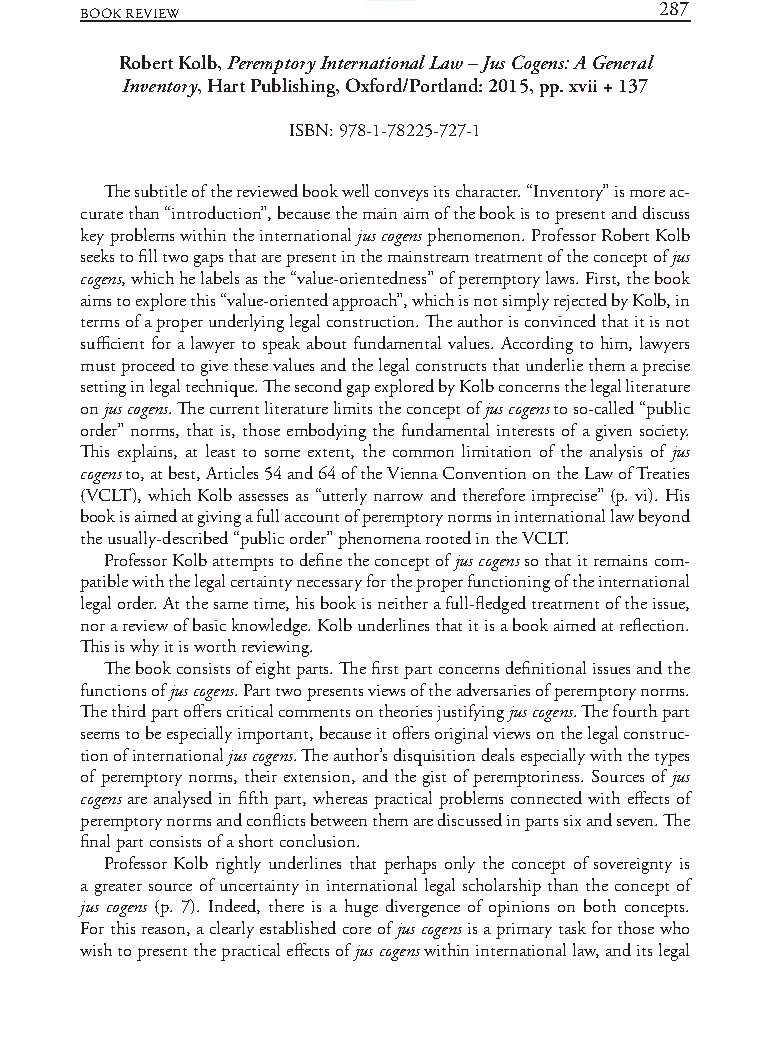 Vol. 36 (2016) Book reviews Robert Kolb, Peremptory International Law – Jus Cogens: A General Inventory, Hart Publishing, Oxford/Portland: 2015, pp. xvii + 137 PDF Roman Kwiecień more info Roman Kwiecień Cracow University of Economics Published 2016-12-31 Copyright (c) 2021 ILS PAS This work is licensed under a Creative Commons Attribution 4.0 International License. How to Cite Robert Kolb, Peremptory International Law – Jus Cogens: A General Inventory, Hart Publishing, Oxford/Portland: 2015, pp. xvii + 137. (2016). Polish Yearbook of International Law, 36, 287-290. https://doi.org/10.7420/pyil2016q More Citation Formats ACM ACS APA ABNT Chicago Harvard IEEE MLA Turabian Vancouver AMA Download Citation Endnote/Zotero/Mendeley (RIS) BibTeX PDF