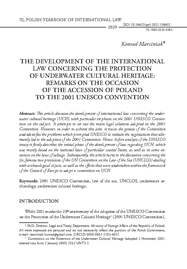 This article discusses the development of international law concerning the underwater cultural heritage (UCH), with particular emphasis on the 2001 UNESCO Convention on the subject. It attempts to set out the main legal solutions adopted in the 2001 Convention. However, in order to achieve this aim, it traces the genesis of the Convention and identifies the problems which prompted UNESCO to initiate the negotiations that ultimately led to the adoption of the 2001 Convention. Hence, before analysis of the UNESCO treaty it firstly describes the initial phase of the development of law regarding UCH, which was mostly based on the national laws of particular coastal States, as well as in some instances on the laws of salvage. Subsequently, the article turns to the discussion concerning the (in)famous two provisions of the UN Convention on the Law of the Sea (UNCLOS) dealing with archaeological objects, as well as the efforts that were undertaken within the framework of the Council of Europe to adopt a convention on UCH.