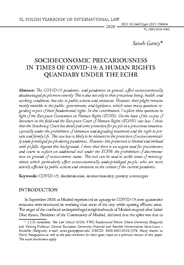 The COVID-19 pandemic, and pandemics in general, affect socioeconomically disadvantaged people more severely. This is due not only to their precarious living, health, and working conditions, but also to public actions and omissions. However, their plight remains mostly invisible to the public, governments, and legislators, which raises many questions regarding respect of their fundamental rights. In this contribution, I explore these questions in light of the European Convention on Human Rights (ECHR). On the basis of the corpus of literature in the field and the European Court of Human Rights (ECtHR) case law, I show that the Strasbourg Court has developed some protection for people in a precarious situation, especially under the prohibition of inhuman and degrading treatment and the right to private and family life. This case law is likely to be relevant to the protection of socioeconomically underprivileged people during pandemics. However, this protection is limited and imbued with pitfalls. Against this background, I show that there is an urgent need for practitioners and courts to explore an additional tool under the ECHR: the prohibition of discrimination on grounds of socioeconomic status. This tool can be used to tackle issues of misrecognition which particularly affect socioeconomically underprivileged people, who are more severely affected by public actions and omissions in the context of the current pandemic.