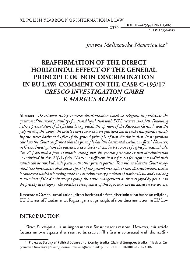 The relevant ruling concerns discrimination based on religion, in particular the question of the incompatibility of national legislation with EU Directive 2000/78. Following a short presentation of the factual background, the opinion of the Advocate General, and the judgment of the Court, the article offers comments on questions raised in the judgment, including the direct horizontal effect of the general principle of non-discrimination. In its previous case law the Court confirmed that the principle has “the horizontal exclusion effect.” However, in Cresco Investigation the question was whether it can be the source of rights for individuals. The ECJ adopted a firm approach, ruling that the general principle of non-discrimination as enshrined in Art. 21(1) of the Charter is sufficient in itself to confer rights on individuals which can be invoked in disputes with other private parties. This means that the Court recognized “the horizontal substitution effect” of the general principle of non-discrimination, which is connected with both setting aside any discriminatory provision of national law and applying to members of the disadvantaged group the same arrangements as those enjoyed by persons in the privileged category. The possible consequences of this approach are discussed in the article.