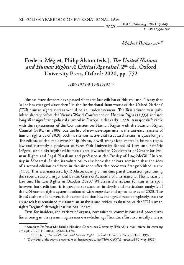 Vol. 40 (2020) Book reviews [Book review: Frederic Mégret, Philip Alston (eds.), The United Nations and Human Rights: A Critical Appraisa] PDF Michał Balcerzak more info Michał Balcerzak Nicolaus Copernicus University Published 2021-11-07 KeywordsUnited Nations,human rights How to Cite [Book review: Frederic Mégret, Philip Alston (eds.), The United Nations and Human Rights: A Critical Appraisa]. (2021). Polish Yearbook of International Law, 40, 311-314. https://doi.org/10.24425/pyil.2021.138443 More Citation Formats ACM ACS APA ABNT Chicago Harvard IEEE MLA Turabian Vancouver AMA Download Citation Endnote/Zotero/Mendeley (RIS) BibTeX Abstract Book review of Frederic Mégret, Philip Alston (eds.), The United Nations and Human Rights: A.Critical Appraisal, 2nd ed., Oxford University Press, Oxford: 2020, pp. 752 (ISBN: 978-0-19-829837-3). PDF References Alston P. (ed.), United Nations and Human Rights, Oxford University Press, Oxford 1992. https://youtu.be/TbVtXIaQTe8