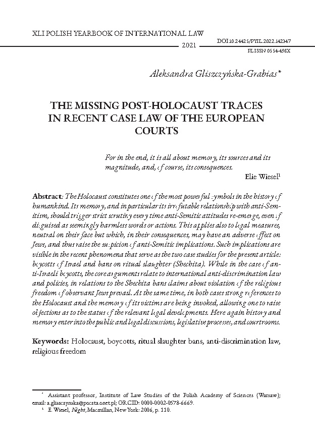 - Gliszczyńska-Grabias A., Never Again as a cornerstone of the Strasbourg system: the traces of the Holocaust in the jurisprudence of the European Court of Human Rights, in: H. Aust, E. Demir-Gürsel (eds.), The European Court of Human Rights: Current Challenges in Historical Perspective, Edward Elgar Publishing, Cheltenham: 2021.