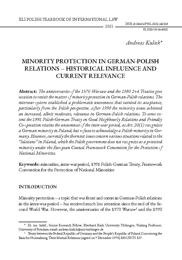 interwar system established a problematic unevenness that tainted its acceptance, particularly from the Polish perspective. After 1990 the minority issues achieved an increased, albeit moderate, relevance in German-Polish relations. To some extent the 1991 Polish-German Treaty on Good Neighbourly Relations and Friendly Co-operation retains the unevenness of the inter-war period, as Art. 20(1) recognizes a German minority in Poland, but refuses to acknowledge a Polish minority in Germany. However, currently the thorniest issues concern various situations related to the “Silesians” in Poland, which the Polish government does not recognize as a protected minority under the European Council Framework Convention for the Protection of National Minorities.