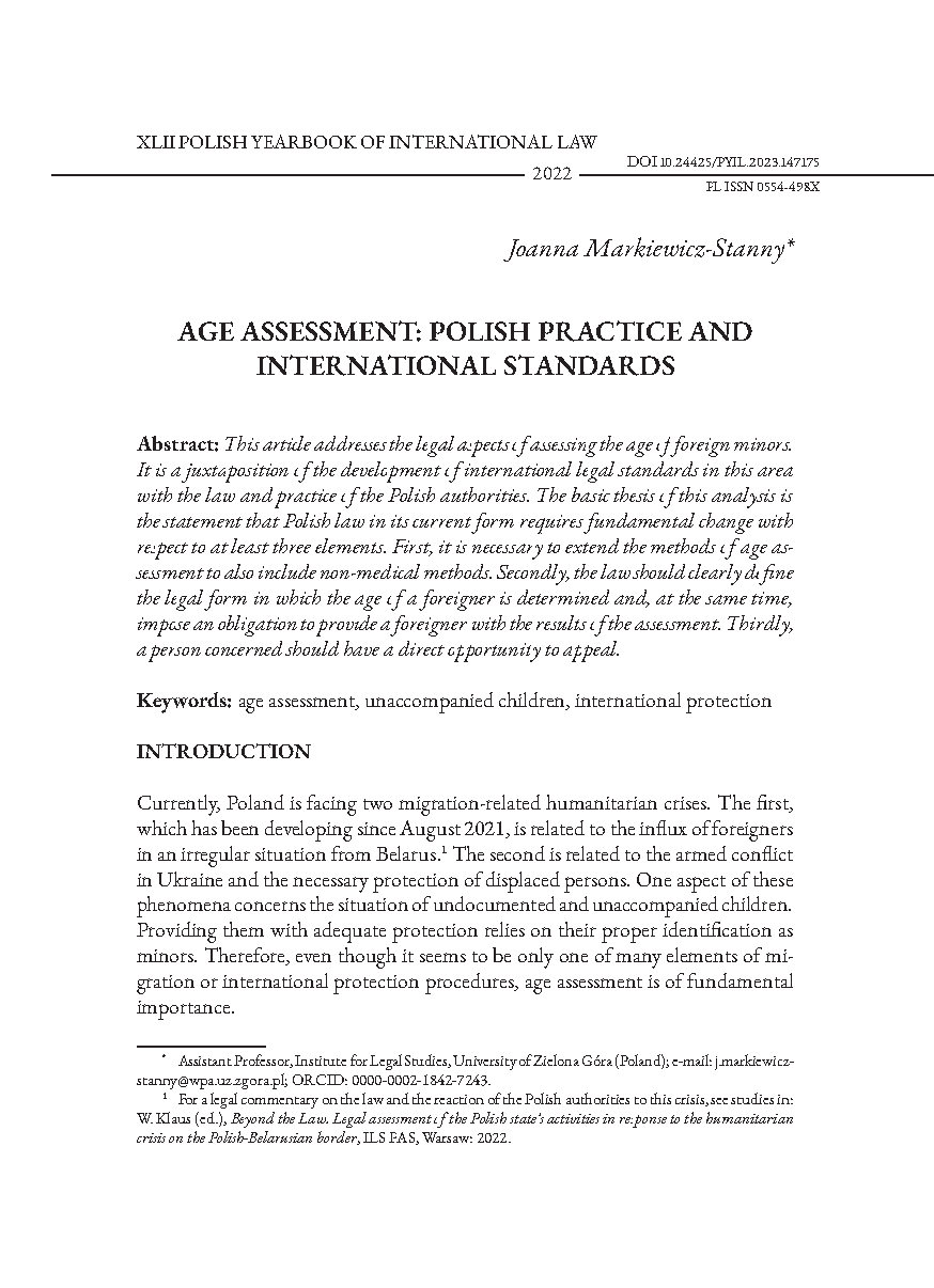This article addresses the legal aspects of assessing the age of foreign minors. It is a juxtaposition of the development of international legal standards in this area with the law and practice of the Polish authorities. The basic thesis of this analysis is the statement that Polish law in its current form requires fundamental change with respect to at least three elements. First, it is necessary to extend the methods of age assessment to also include non-medical methods. Secondly, the law should clearly define the legal form in which the age of a foreigner is determined and, at the same time, impose an obligation to provide a foreigner with the results of the assessment. Thirdly, a person concerned should have a direct opportunity to appeal.