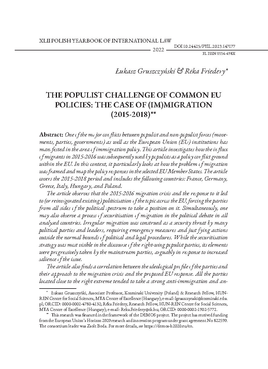 One of the major conflicts between populist and non-populist forces (movements, parties, governments) as well as the European Union (EU) institutions has manifested in the area of immigration policy. This article investigates how the influx of migrants in 2015-2016 was subsequently used by populists as a policy conflict ground within the EU. In this context, it particularly looks at how the problem of migration was framed and map the policy responses in the selected EU Member States. The article covers the 2015-2018 period and includes the following countries: France, Germany, Greece, Italy, Hungary, and Poland.