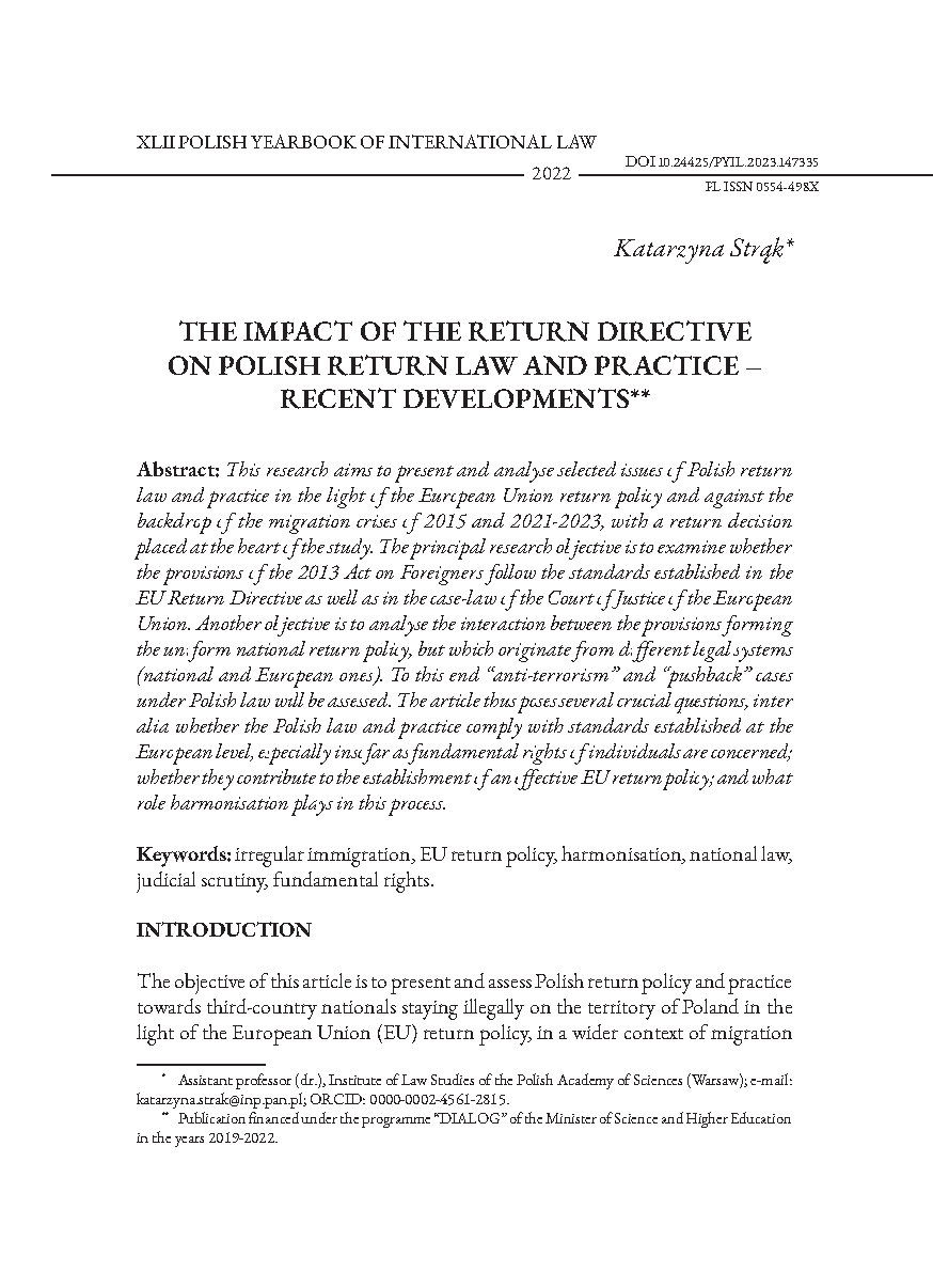 This research aims to present and analyse selected issues of Polish return law and practice in the light of the European Union return policy and against the backdrop of the migration crises of 2015 and 2021-2023, with a return decision placed at the heart of the study. The principal research objective is to examine whether the provisions of the 2013 Act on Foreigners follow the standards established in the EU Return Directive as well as in the case-law of the Court of Justice of the European Union. Another objective is to analyse the interaction between the provisions forming the uniform national return policy, but which originate from different legal systems (national and European ones). To this end “anti-terrorism” and “pushback” cases under Polish law will be assessed. The article thus poses several crucial questions, inter alia whether the Polish law and practice comply with standards established at the European level, especially insofar as fundamental rights of individuals are concerned; whether they contribute to the establishment of an effective EU return policy; and what role harmonisation plays in this process.