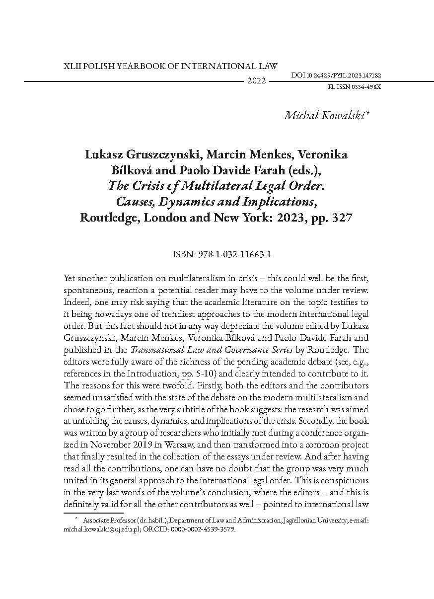 Lukasz Gruszczynski, Marcin Menkes, Veronika Bílková and Paolo Davide Farah (eds.), The Crisis of Multilateral Legal Order. Causes, Dynamics and Implications, Routledge, London and New York: 2023, pp. 327. (2023).