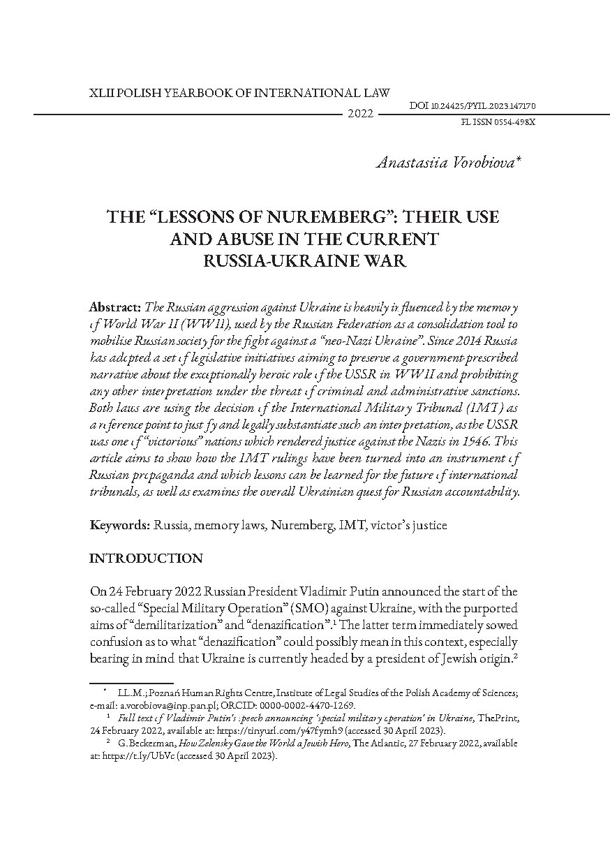 The Russian aggression against Ukraine is heavily influenced by the memory of World War II (WWII), used by the Russian Federation as a consolidation tool to mobilise Russian society for the fight against a “neo-Nazi Ukraine”. Since 2014 Russia has adopted a set of legislative initiatives aiming to preserve a government-prescribed narrative about the exceptionally heroic role of the USSR in WWII and prohibiting any other interpretation under the threat of criminal and administrative sanctions. Both laws are using the decision of the International Military Tribunal (IMT) as a reference point to justify and legally substantiate such an interpretation, as the USSR was one of “victorious” nations which rendered justice against the Nazis in 1946. This article aims to show how the IMT rulings have been turned into an instrument of Russian propaganda and which lessons can be learned for the future of international tribunals, as well as examines the overall Ukrainian quest for Russian accountability.