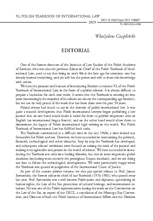 Vol. 40 (2020) Editorial Editorial PDF Władysław Czapliński more info Władysław Czapliński Institute of Law Studies, Polish Academy of Sciences Published 2021-11-07 How to Cite Editorial. (2021). Polish Yearbook of International Law, 40, 7-8. https://czasopisma.inp.pan.pl/index.php/pyil/article/view/4236 More Citation Formats ACM ACS APA ABNT Chicago Harvard IEEE MLA Turabian Vancouver AMA Download Citation Endnote/Zotero/Mendeley (RIS) BibTeX PDF