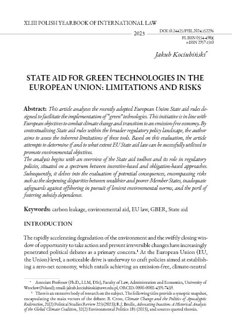 This article analyzes the recently adopted European Union State aid rules designed to facilitate the implementation of “green” technologies. This initiative is in line with European objectives to combat climate change and transition to an emission-free economy. By contextualizing State aid rules within the broader regulatory policy landscape, the author aims to assess the inherent limitations of these tools. Based on this evaluation, the article attempts to determine if and to what extent EU State aid law can be successfully utilized to promote environmental objectives.