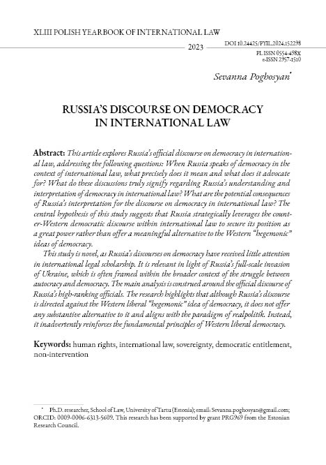 This study is novel, as Russia’s discourses on democracy have received little attention in international legal scholarship. It is relevant in light of Russia’s full-scale invasion of Ukraine, which is often framed within the broader context of the struggle between autocracy and democracy. The main analysis is construed around the official discourse of Russia’s high-ranking officials. The research highlights that although Russia’s discourse is directed against the Western liberal “hegemonic” idea of democracy, it does not offer any substantive alternative to it and aligns with the paradigm of realpolitik. Instead, it inadvertently reinforces the fundamental principles of Western liberal democracy.