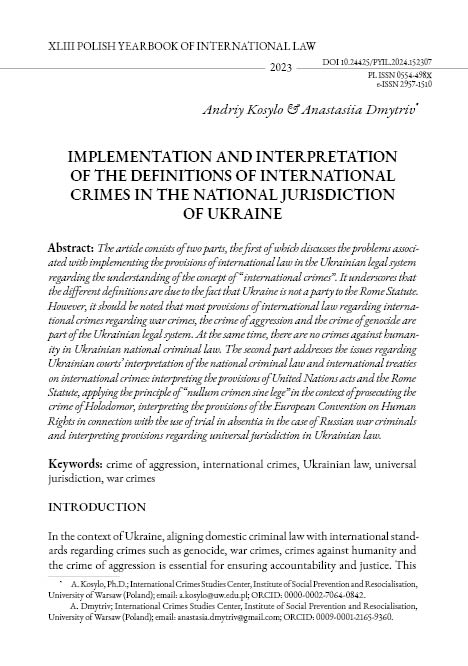 The article consists of two parts, the first of which discusses the problems associated with implementing the provisions of international law in the Ukrainian legal system regarding the understanding of the concept of “international crimes”. It underscores that the different definitions are due to the fact that Ukraine is not a party to the Rome Statute. However, it should be noted that most provisions of international law regarding international crimes regarding war crimes, the crime of aggression and the crime of genocide are part of the Ukrainian legal system. At the same time, there are no crimes against humanity in Ukrainian national criminal law. The second part addresses the issues regarding Ukrainian courts’ interpretation of the national criminal law and international treaties on international crimes: interpreting the provisions of United Nations acts and the Rome Statute, applying the principle of “nullum crimen sine lege”in the context of prosecuting the crime of Holodomor, interpreting the provisions of the European Convention on Human Rights in connection with the use of trial in absentia in the case of Russian war criminals and interpreting provisions regarding universal jurisdiction in Ukrainian law.
