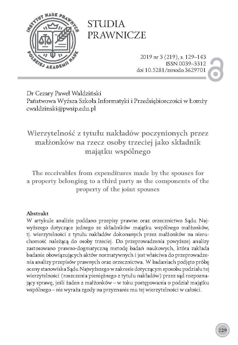 Wierzytelność z tytułu nakładów poczynionych przez małżonków na rzecz osoby trzeciej jako składnik majątku wspólnego: [The receivables from expenditures made by the spouses for a property belonging to a third party as the components of the property of the joint spouses]. (2019). Studia Prawnicze The Legal Studies, 3 (219), 129-143. https://doi.org/10.37232/sp.2019.3.5