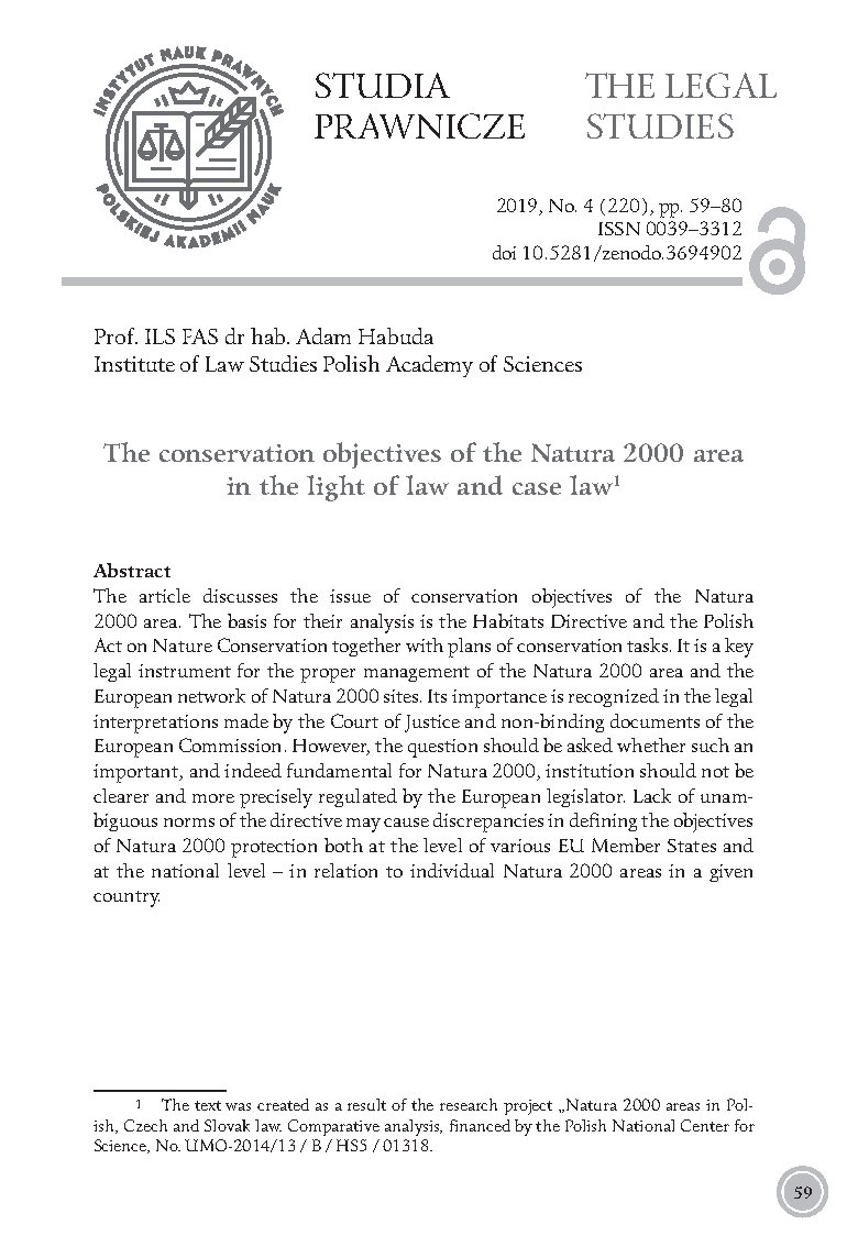 The article discusses the issue of conservation objectives of the Natura 2000 area. The basis for their analysis is the Habitats Directive and the Polish Act on Nature Conservation together with plans of conservation tasks. It is a key legal instrument for the proper management of the Natura 2000 area and the European network of Natura 2000 sites. Its importance is recognized in the legal interpretations made by the Court of Justice and non-binding documents of the European Commission. However, the question should be asked whether such an important, and indeed fundamental for Natura 2000, institution should not be clearer and more precisely regulated by the European legislator. Lack of unambiguous norms of the directive may cause discrepancies in defining the objectives of Natura 2000 protection both at the level of various EU Member States and at the national level – in relation to individual Natura 2000 areas in a given country.