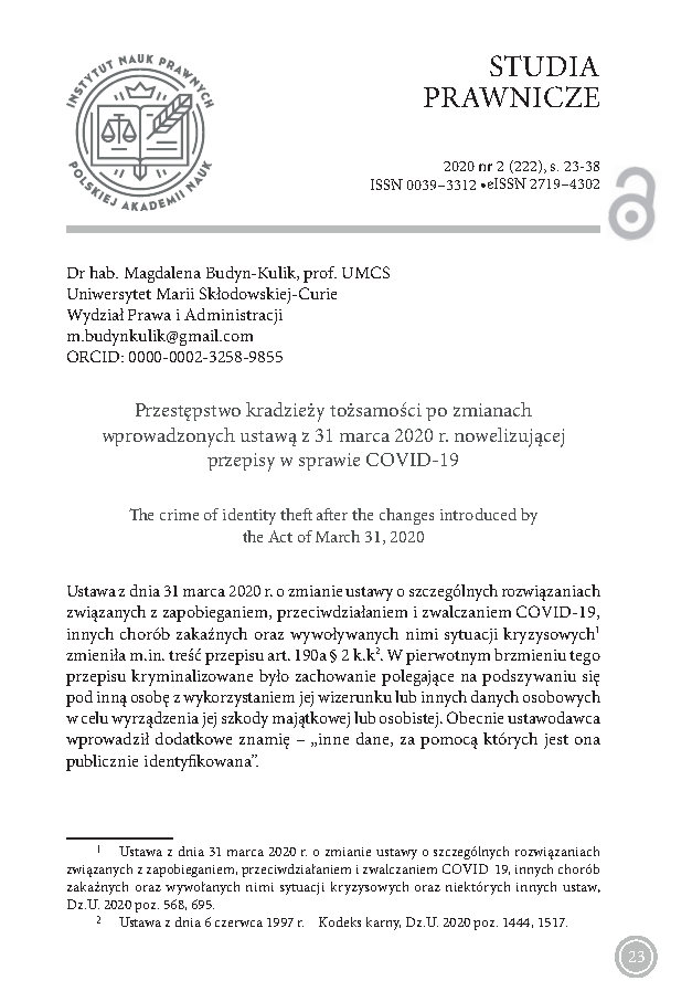 Przestępstwo kradzieży tożsamości po zmianach wprowadzonych ustawą z 31 marca 2020 r. nowelizującej przepisy w sprawie COVID-19: [The crime of identity theft after the changes introduced by the Act of March 31, 2020]. (2020). Studia Prawnicze The Legal Studies, 2(222), 23-38. https://doi.org/10.37232/sp.2020.2.1