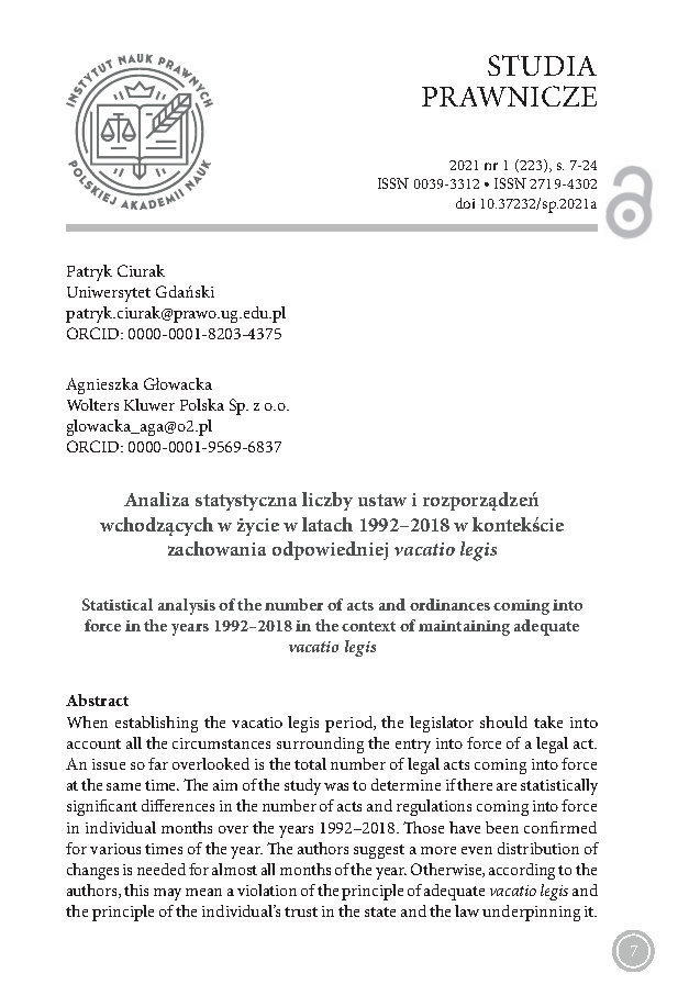 Ustanawiając okres vacatio legis prawodawca powinien wziąć pod uwagę całokształt okoliczności towarzyszących wejściu w życie aktu prawnego. Do tej pory pomijano ogólną liczbę aktów prawnych wchodzących w życie w tym samym czasie. Celem badania było określenie, czy istnieją istotne statystycznie różnice w liczbie ustaw i rozporządzeń wchodzących w życie w poszczególnych miesiącach na przestrzeni lat 1992–2018. Istnienie różnic potwierdzono analizą zebranych danych. Autorzy postulują bardziej równomierne rozłożenie zmian w prawie na wszystkie miesiące roku. Przeciwny wypadek może – zdaniem autorów – oznaczać to naruszenie zasady odpowiedniej vacatio legis oraz będącej jej podstawą zasady zaufania jednostki do państwa i stanowionego przez nie prawa.