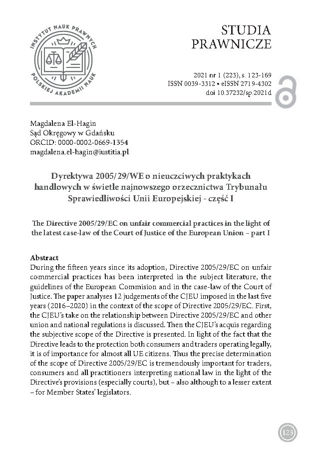 Dyrektywa 2005/29/WE o nieuczciwych praktykach handlowych obowiązuje od ponad 15 lat. W tym czasie interpretowana była w literaturze przedmiotu, wytycznych Komisji Europejskiej oraz orzecznictwie Trybunału Sprawiedliwości UE. W niniejszym opracowaniu przeanalizowano 12 orzeczeń TSUE z ostatnich pięciu lat (2016–2021). W pierwszej kolejności omówiono stanowisko TSUE w przedmiocie relacji dyrektywy 2005/29/WE do innych instrumentów unijnych i krajowych. Następnie przedstawiono dorobek TSUE w kwestii podmiotowego zakresu stosowania dyrektywy 2005/29/WE. Z uwagi na fakt, że dyrektywa zmierza do ochrony zarówno konsumentów, jak i profesjonalistów funkcjonujących zgodnie z prawem, ma ona znaczenie dla – bez mała – ogółu obywateli UE. W tym kontekście precyzyjne określenie zakresu jej stosowania jest niezwykle istotne dla przedsiębiorców, konsumentów oraz wszystkich praktyków interpretujących prawo krajowe w świetle przepisów dyrektywy (zwłaszcza sądów), a także – choć w mniejszym zakresie – dla ustawodawców krajowych.