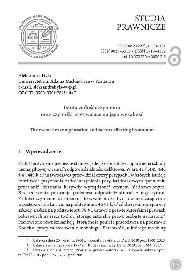 The study concerns the institution of compensation, which is one of the ways to compensate for non-pecuniary damage. The sum of money awarded is intended to compensate for physical and psychological suffering and consequently – to constitute a kind of non-pecuniary damage equivalent. In order to implement this function, the amount of compensation must be duly determined based on factors relevant to the facts. Determining whether the injured person should be compensated, and with what amount, is the competence of the court. This article discusses examples of factors which the court should use to determine the amount of compensation. At the same time, discussion of this issue outlines how challenging it is for the court to implement the compensatory function of this institution.