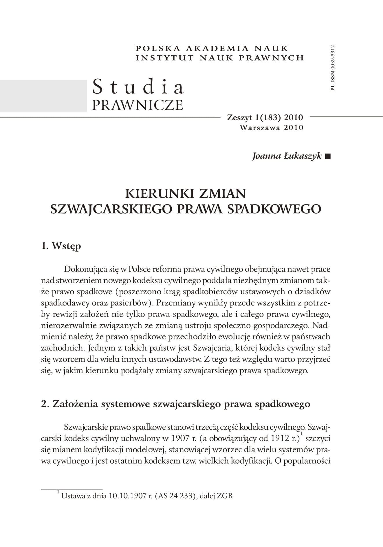 Dokonująca się w Polsce reforma prawa cywilnego obejmująca nawet prace nad stworzeniem nowego kodeksu cywilnego poddała niezbędnym zmianom także prawo spadkowe (poszerzono krąg spadkobierców ustawowych o dziadkówspadkodawcy oraz pasierbów). Przemiany wynikły przede wszystkim z potrzeby rewizji założeń nie tylko prawa spadkowego, ale i całego prawa cywilnego, nierozerwalnie związanych ze zmianą ustroju społeczno-gospodarczego. Nadmienić należy, że prawo spadkowe przechodziło ewolucję również w państwach zachodnich. Jednym z takich państw jest Szwajcaria, której kodeks cywilny stałsię wzorcem dla wielu innych ustawodawstw. Z tego też względu warto przyjrzeć się, w jakim kierunku podążały zmiany szwajcarskiego prawa spadkowego.