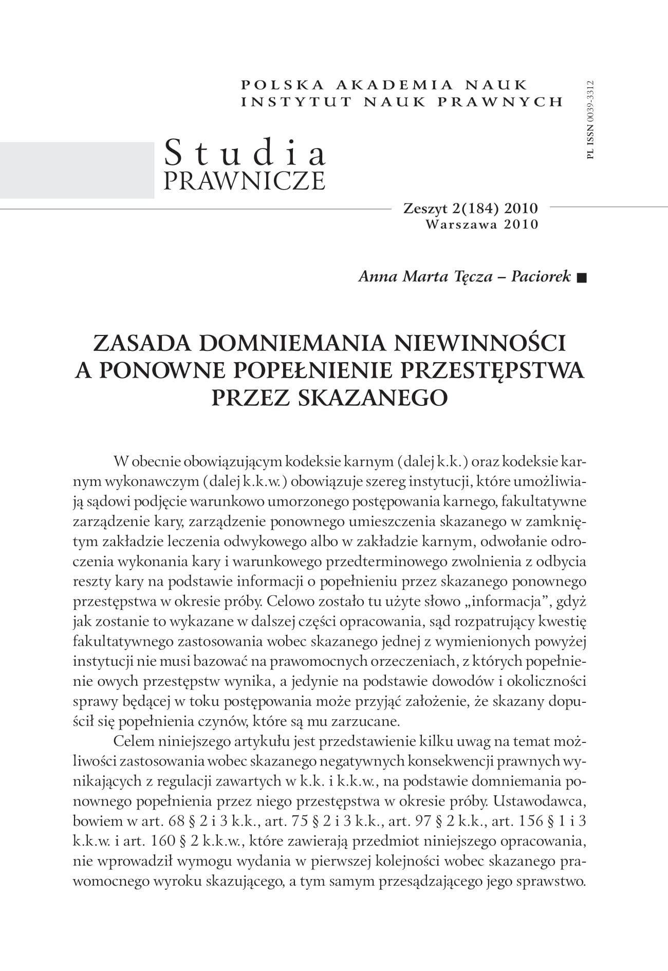 Celem niniejszego artykułu jest przedstawienie kilku uwag na temat możliwości zastosowania wobec skazanego negatywnych konsekwencji prawnych wynikających z regulacji zawartych w k.k. i k.k.w., na podstawie domniemania ponownego popełnienia przez niego przestępstwa w okresie próby. Ustawodawca, bowiem w art. 68 § 2 i 3 k.k., art. 75 § 2 i 3 k.k., art. 97 § 2 k.k., art. 156 § 1 i 3 k.k.w. i art. 160 § 2 k.k.w., które zawierają przedmiot niniejszego opracowania, nie wprowadził wymogu wydania w pierwszej kolejności wobec skazanego prawomocnego wyroku skazującego, a tym samym przesądzającego jego sprawstwo. Z uwagi na obowiązującą od czterdziestu lat, wyrażoną expressis verbis, zasadę domniemania niewinności, taki stan rzeczy nie powinien mieć racji bytu. Niniejszy artykuł ma być zatem próbą udzielenia odpowiedzi na pytanie czy dopuszczalnym jest, aby zasada domniemania niewinności jako zasada wzruszalna, mogła być obalona w inny sposób, aniżeli przez wydanie prawomocnego wyroku skazującego.