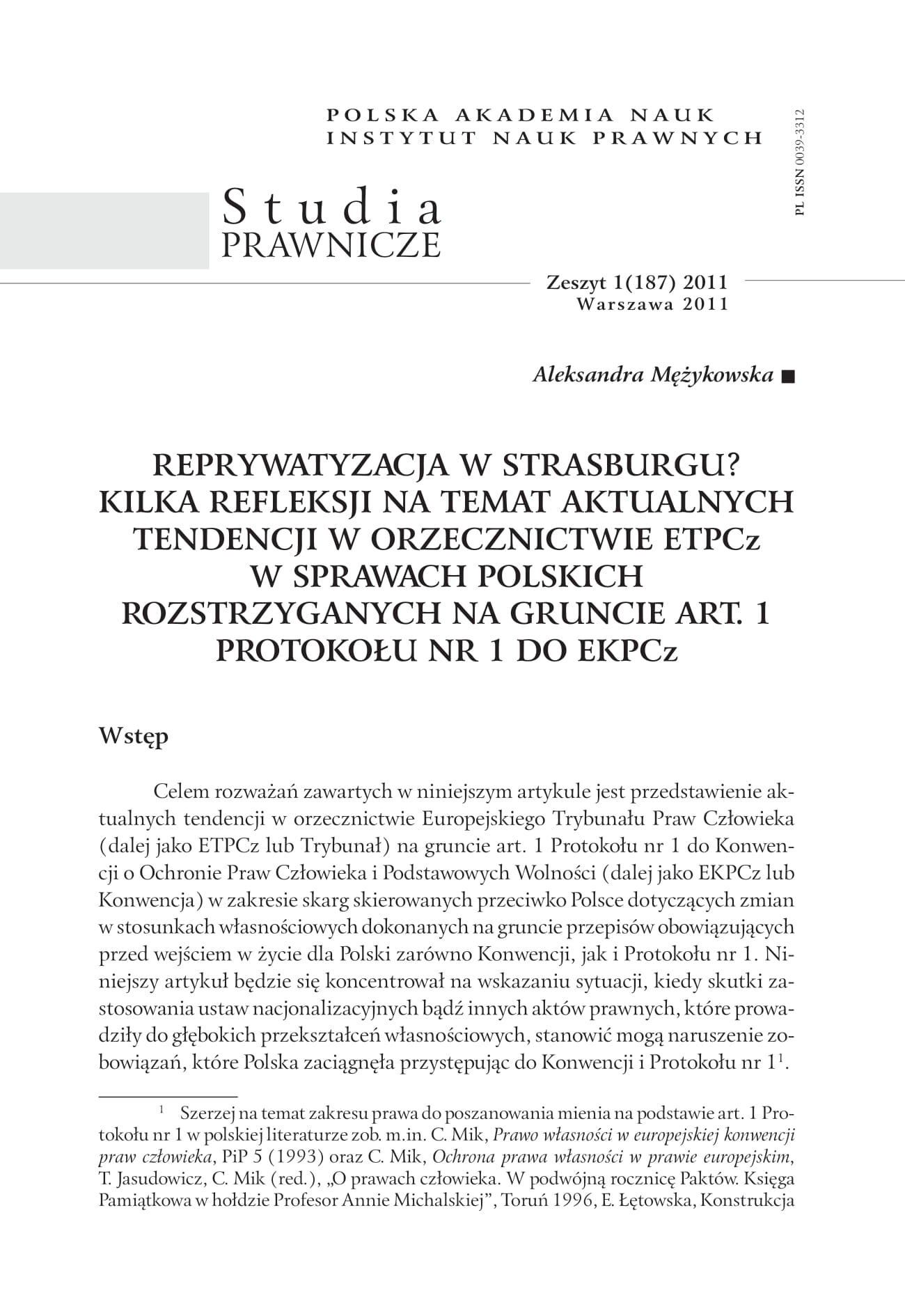 Celem rozważań zawartych w niniejszym artykule jest przedstawienie aktualnych tendencji w orzecznictwie Europejskiego Trybunału Praw Człowieka (dalej jako ETPCz lub Trybunał) na gruncie art. 1 Protokołu nr 1 do Konwencji o Ochronie Praw Człowieka i Podstawowych Wolności (dalej jako EKPCz lub Konwencja) w zakresie skarg skierowanych przeciwko Polsce dotyczących zmian w stosunkach własnościowych dokonanych na gruncie przepisów obowiązujących przed wejściem w życie dla Polski zarówno Konwencji, jak i Protokołu nr 1. Niniejszy artykuł będzie się koncentrował na wskazaniu sytuacji, kiedy skutki zastosowania ustaw nacjonalizacyjnych bądź innych aktów prawnych, które prowadziły do głębokich przekształceń własnościowych, stanowić mogą naruszenie zobowiązań, które Polska zaciągnęła przystępując do Konwencji i Protokołu nr 1.