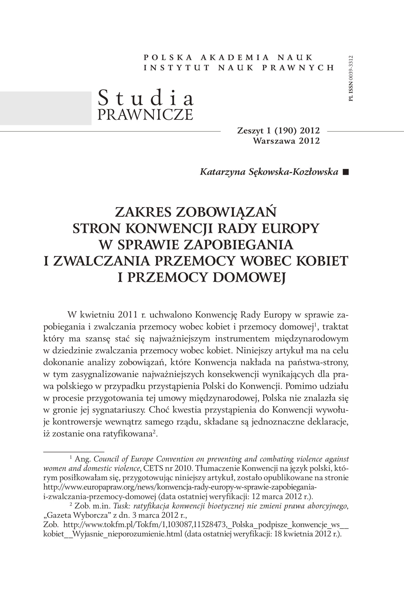 W kwietniu 2011 r. uchwalono Konwencję Rady Europy w sprawie zapobiegania i zwalczania przemocy wobec kobiet i przemocy domowej, traktat który ma szansę stać się najważniejszym instrumentem międzynarodowym w dziedzinie zwalczania przemocy wobec kobiet. Niniejszy artykuł ma na celu dokonanie analizy zobowiązań, które Konwencja nakłada na państwa-strony, w tym zasygnalizowanie najważniejszych konsekwencji wynikających dla prawa polskiego w przypadku przystąpienia Polski do Konwencji. Pomimo udziału w procesie przygotowania tej umowy międzynarodowej, Polska nie znalazła się w gronie jej sygnatariuszy. Choć kwestia przystąpienia do Konwencji wywołuje kontrowersje wewnątrz samego rządu, składane są jednoznaczne deklaracje, iż zostanie ona ratyfikowana.