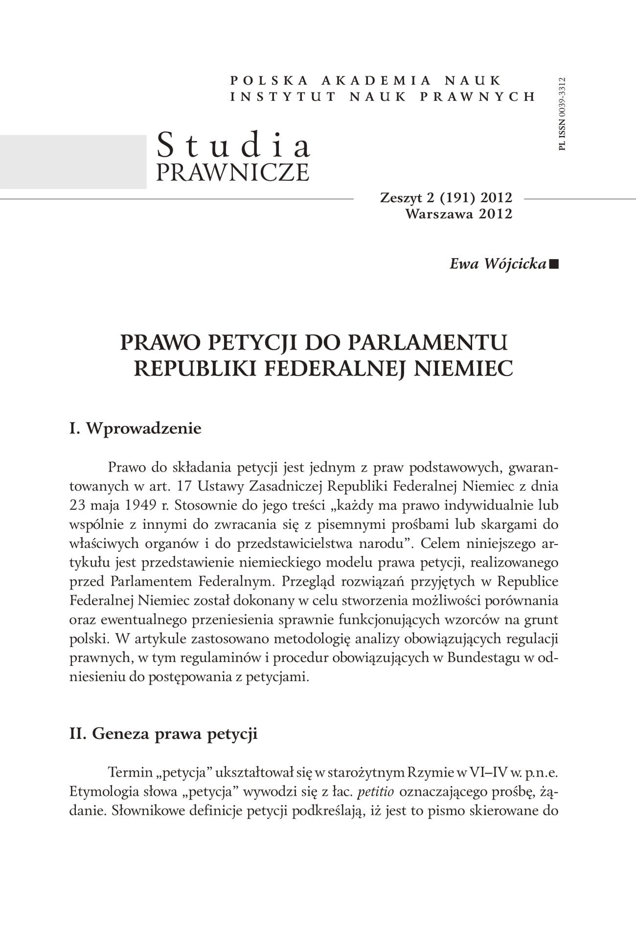 Prawo do składania petycji jest jednym z praw podstawowych, gwarantowanych w art. 17 Ustawy Zasadniczej Republiki Federalnej Niemiec z dnia 23 maja 1949 r. Stosownie do jego treści „każdy ma prawo indywidualnie lub wspólnie z innymi do zwracania się z pisemnymi prośbami lub skargami do właściwych organów i do przedstawicielstwa narodu”. Celem niniejszego artykułu jest przedstawienie niemieckiego modelu prawa petycji, realizowanego przed Parlamentem Federalnym. Przegląd rozwiązań przyjętych w Republice Federalnej Niemiec został dokonany w celu stworzenia możliwości porównania oraz ewentualnego przeniesienia sprawnie funkcjonujących wzorców na grunt polski. W artykule zastosowano metodologię analizy obowiązujących regulacji prawnych, w tym regulaminów i procedur obowiązujących w Bundestagu w odniesieniu do postępowania z petycjami.