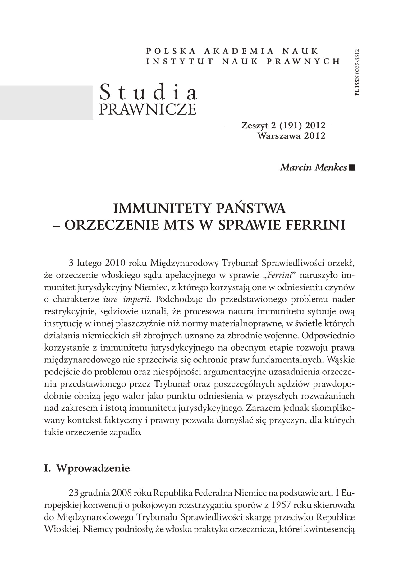 3 lutego 2010 roku Międzynarodowy Trybunał Sprawiedliwości orzekł, że orzeczenie włoskiego sądu apelacyjnego w sprawie „Ferrini” naruszyło immunitet jurysdykcyjny Niemiec, z którego korzystają one w odniesieniu czynów o charakterze iure imperii. Podchodząc do przedstawionego problemu nader restrykcyjnie, sędziowie uznali, że procesowa natura immunitetu sytuuje ową instytucję w innej płaszczyźnie niż normy materialnoprawne, w świetle których działania niemieckich sił zbrojnych uznano za zbrodnie wojenne. Odpowiednio korzystanie z immunitetu jurysdykcyjnego na obecnym etapie rozwoju prawa międzynarodowego nie sprzeciwia się ochronie praw fundamentalnych. Wąskie podejście do problemu oraz niespójności argumentacyjne uzasadnienia orzeczenia przedstawionego przez Trybunał oraz poszczególnych sędziów prawdopodobnie obniżą jego walor jako punktu odniesienia w przyszłych rozważaniach nad zakresem i istotą immunitetu jurysdykcyjnego. Zarazem jednak skomplikowany kontekst faktyczny i prawny pozwala domyślać się przyczyn, dla których takie orzeczenie zapadło.