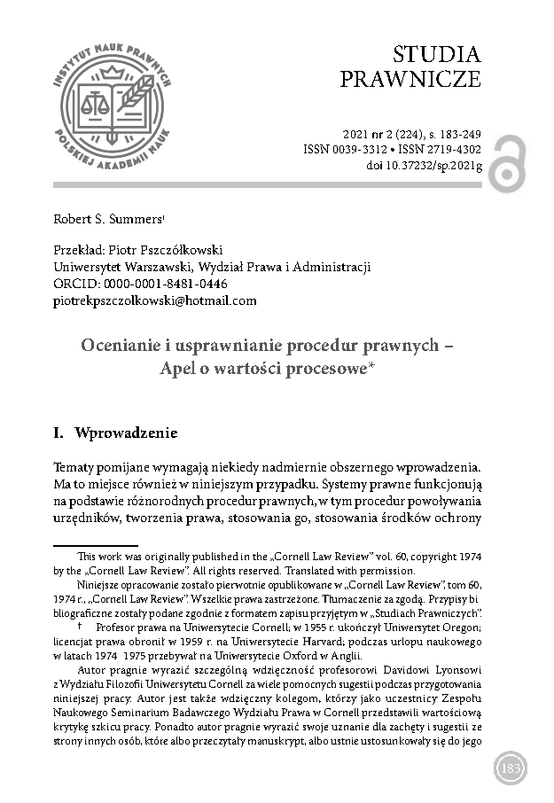 Ocenianie i ulepszanie procedur prawnych: apel o wartości procesowe: [Evaluating and Improving Legal Processes A Plea for Process Values by Robert Summers]. (2021). Studia Prawnicze The Legal Studies, 2 (224), 183-249. https://doi.org/10.37232/sp.2021g