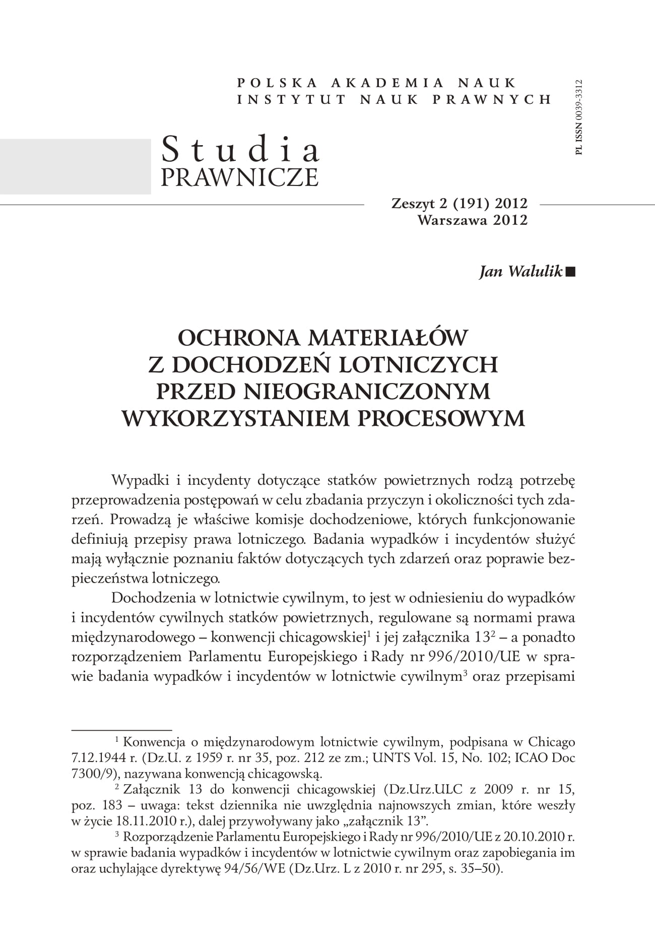 - Walulik J., Status ustaleń lotniczych komisji dochodzeniowych, „Kontrola Państwowa” 2012 nr 2, S. 87–108.