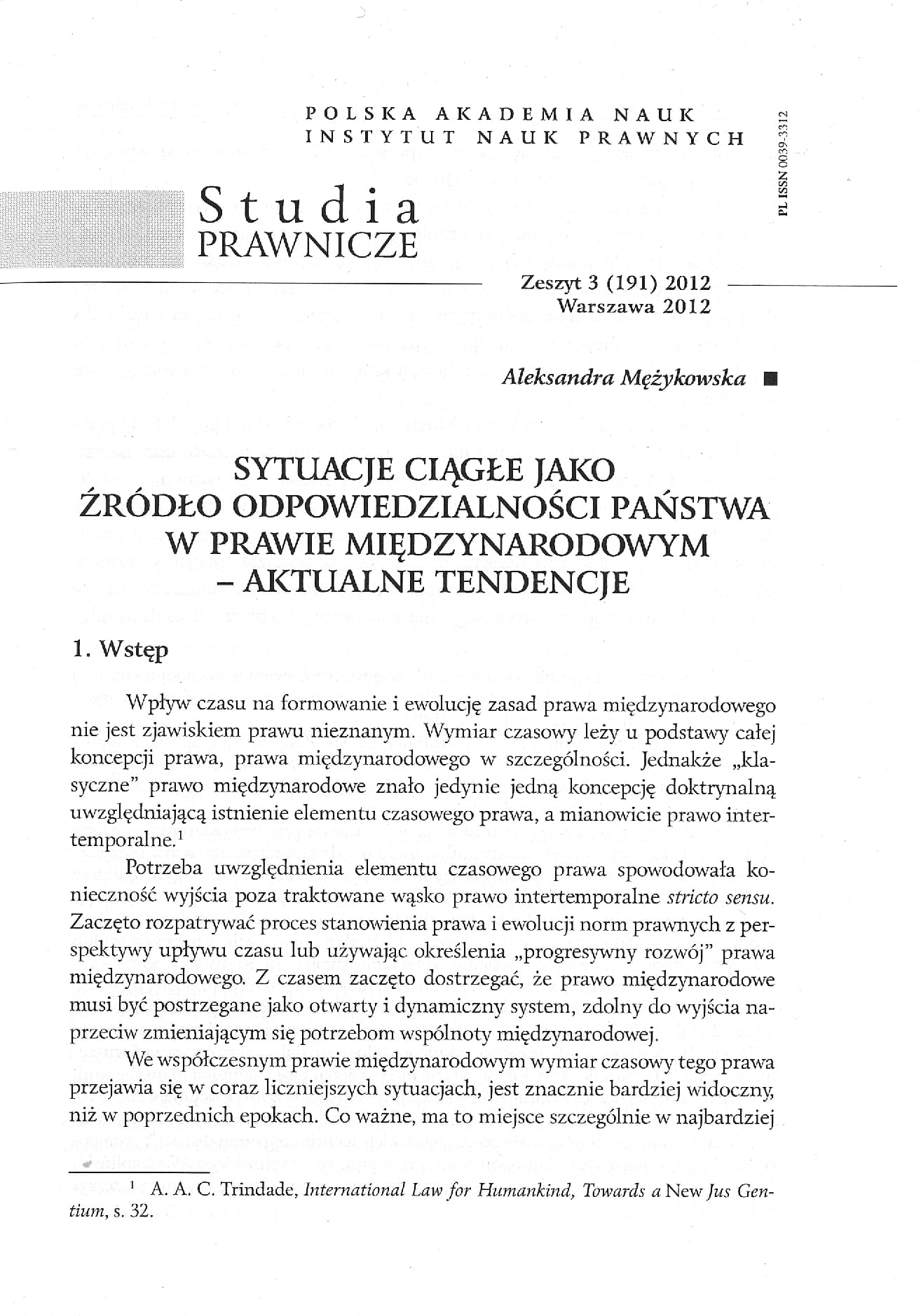 The article presents an analysis of continuing situations stricto sensu, with the main focus on the domain of human rights. The concept finds its application in circumstances where there is a continuum between the past and presence. Despite the fact that it traces back to the 19th century, the exact scope of its application as well as the legal consequences are disputable. The purpose of this analysis is to indicate the legal aspects that have to be taken into account while assessing this continuity. The author provides an overview of the relevant case-law of international courts: the Permanent Court of International Justice, European Court of Human Rights and International Court of Justice. Due to the fact that the possibility of continuing situations was foreseen by the International Law Commission, the paper refers to Article 14 of its Draft Articles on State Responsibility. The author argues that the case-law developed by international judicial organs on the basis/or in reference to international human rights treaties reflects the understanding of continuing situations in general international law. However, the key factor allowing to classify a situation as a continuing one refers to identifying the legal aspects of the continuity. Consequently, the following elements are of crucial importance in the discussion: the scope of the international obligation, the acts/or facts constituting the alleged interference in the right, date of commission of the interference, as well as the special circumstances of the case. Taking into account the evolving character of obligations incumbent upon states in the field of human rights, the concept of continuing situations may have significant effect on the accountability of certain acts for states and, as a result, increase the protection of potential victims.