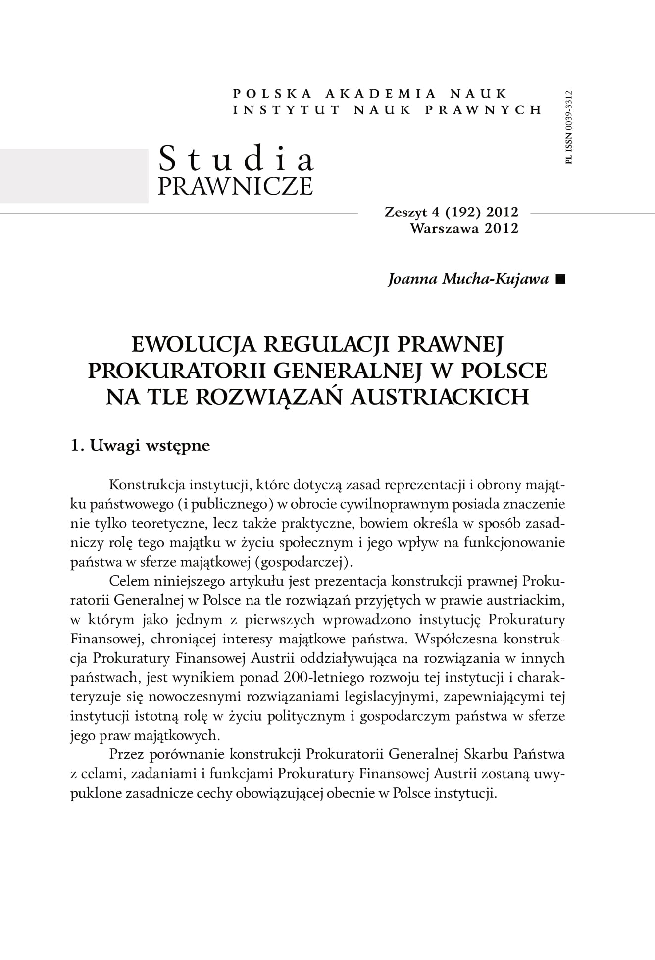 Celem niniejszego artykułu jest prezentacja konstrukcji prawnej Prokuratorii Generalnej w Polsce na tle rozwiązań przyjętych w prawie austriackim, w którym jako jednym z pierwszych wprowadzono instytucję Prokuratury Finansowej, chroniącej interesy majątkowe państwa. Współczesna konstrukcja Prokuratury Finansowej Austrii oddziaływująca na rozwiązania w innych państwach, jest wynikiem ponad 200-letniego rozwoju tej instytucji i charakteryzuje się nowoczesnymi rozwiązaniami legislacyjnymi, zapewniającymi tej instytucji istotną rolę w życiu politycznym i gospodarczym państwa w sferze jego praw majątkowych.
