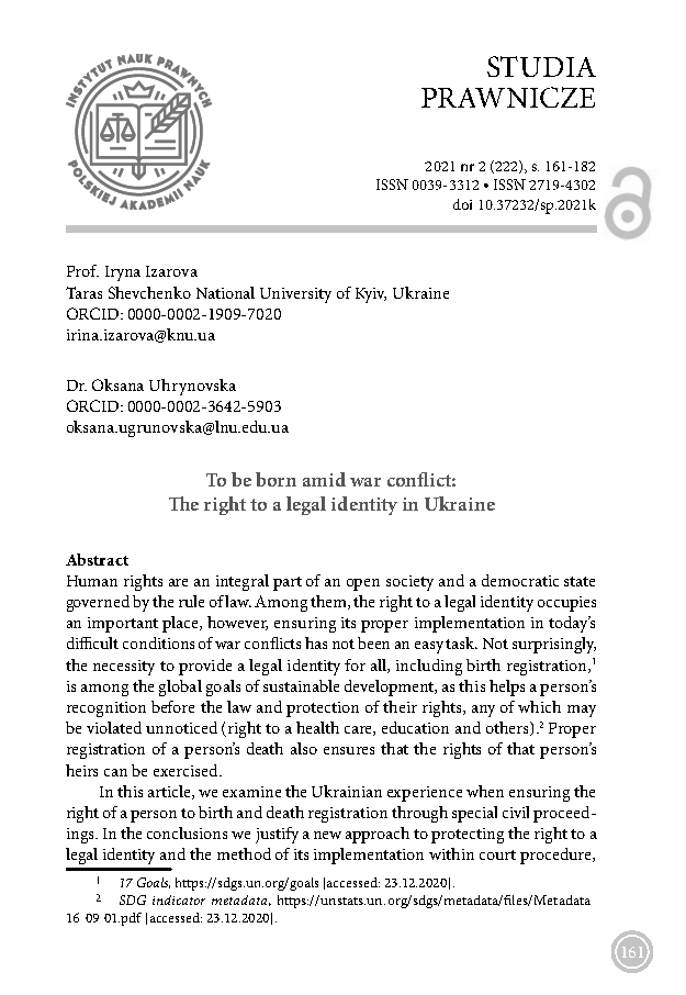 Human rights are an integral part of an open society and a democratic state governed by the rule of law. Among them, the right to a legal identity occupies an important place, however, ensuring its proper implementation in today's difficult conditions of war conflicts has not been an easy task. Not surprisingly, the necessity to provide a legal identity for all, including birth registration, is among the global goals of sustainable development, as this helps a person`s recognition before the law and protection of their rights, any of which may be violated unnoticed (right to a health care, education and others). Proper registration of a person's death also ensures that the rights of that person's heirs can be exercised.