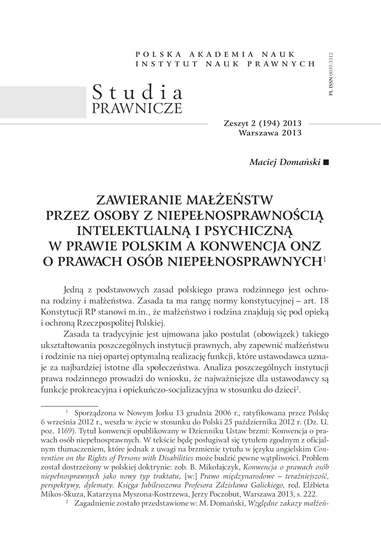 According to Polish legal system it is not possible for persons affected by „mental illness” or „mental retardation” to marry (article 12 Family and Guardianship Code). As an exception to this rule, the Court may authorize the conclusion of such marriage, if the person’s condition does not put „marriage” or „the future health of the off spring” in hazard. This adjustment was justified by the traditional understanding of the principle of the protection of marriage and family, concern about the lack of „capability” of the patient to meet one’s marriage commitments, the recognition of lack of parental competences in people with mental disabilities and mental illness, and the danger of „transferring” the illness to the children of parents. Acts of international law provide for a different design, accenting the right to marry and to found a family (article 12 European Convention on Human Rights). For people with disabilities, article 23 of the Convention on the Rights of Persons With Disabilities which guarantees the right to marry and to found a family of all persons with disabilities, including mental and intellectual, is of particular importance. The conventional solutions analysis leads to the conclusion that not only the current article 12 Family and Guardianship Code is contrary to the Convention but to establish similar restrictions based on the health status of the betrothed could be regarded as discriminatory and contrary to the Convention. It should be noted that the progressive interpretation of the Convention on the Rights of Persons with Disabilities can lead to conflicts between solutions of the act of international law and the national rules of family law which are based on the traditionally understood principles of the protection of the family and child welfare. It is therefore necessary to find solutions and develop compromise in the process of adaptation of Polish law to the requirements of conventional solutions.