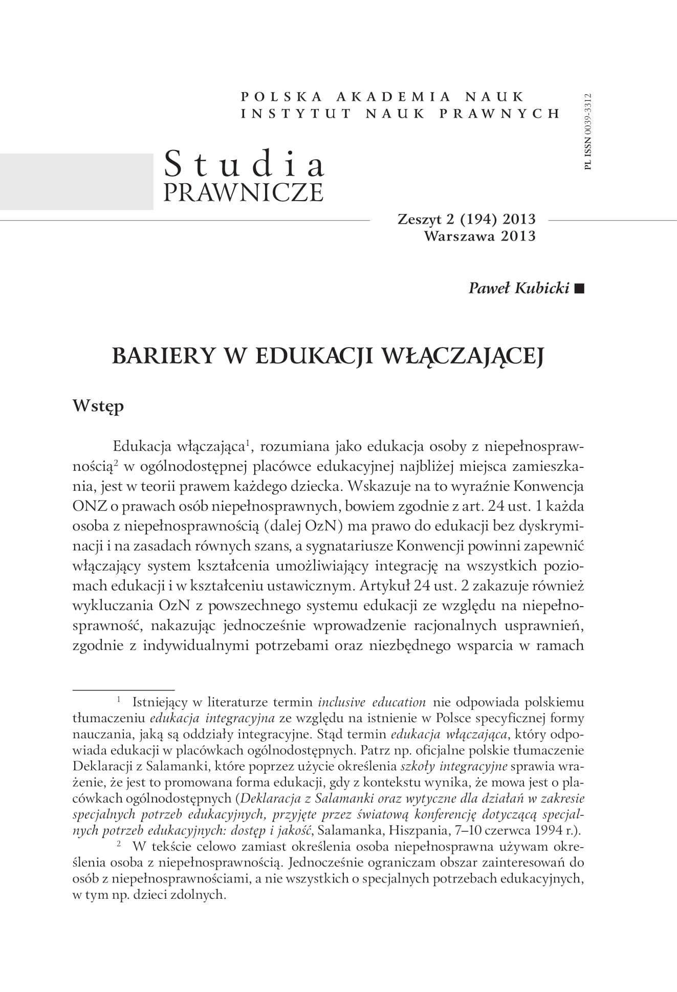 Edukacja włączająca, rozumiana jako edukacja osoby z niepełnosprawnością w ogólnodostępnej placówce edukacyjnej najbliżej miejsca zamieszkania, jest w teorii prawem każdego dziecka. Wskazuje na to wyraźnie Konwencja ONZ o prawach osób niepełnosprawnych, bowiem zgodnie z art. 24 ust. 1 każda osoba z niepełnosprawnością (dalej OzN) ma prawo do edukacji bez dyskrymi-nacji i na zasadach równych szans, a sygnatariusze Konwencji powinni zapewnić włączający system kształcenia umożliwiający integrację na wszystkich poziomach edukacji i w kształceniu ustawicznym. Artykuł 24 ust. 2 zakazuje również wykluczania OzN z powszechnego systemu edukacji ze względu na niepełnosprawność, nakazując jednocześnie wprowadzenie racjonalnych usprawnień, zgodnie z indywidualnymi potrzebami oraz niezbędnego wsparcia w ramach powszechnego systemu edukacji. Równość w dostępie do edukacji gwarantuje również Konstytucja RP, bowiem zgodnie z art. 70 każdy ma prawo do nauki (...). Władze publiczne zapewniają obywatelom powszechny i równy dostęp do wykształcenia (...) oraz podstawowy akt prawny dotyczący edukacji, jakim jest w naszym kraju ustawa z dnia 7 września 1991 r. o systemie oświaty (Dz. U. z 2004 r. Nr 256, poz. 2572 ze zm.). Zgodnie z art. 1: System oświaty zapewnia w szczególności: (...) możliwość pobierania nauki we wszystkich typach szkół przez dzieci i młodzież niepełnosprawną oraz niedostosowaną społecznie, zgod-nie z indywidualnymi potrzebami rozwojowymi i edukacyjnymi oraz predyspozycjami, a także opiekę nad uczniami niepełnosprawnymi przez umożliwianie realizowania zindywidualizowanego procesu kształcenia, form i programów na-uczania oraz zajęć rewalidacyjnych (...).