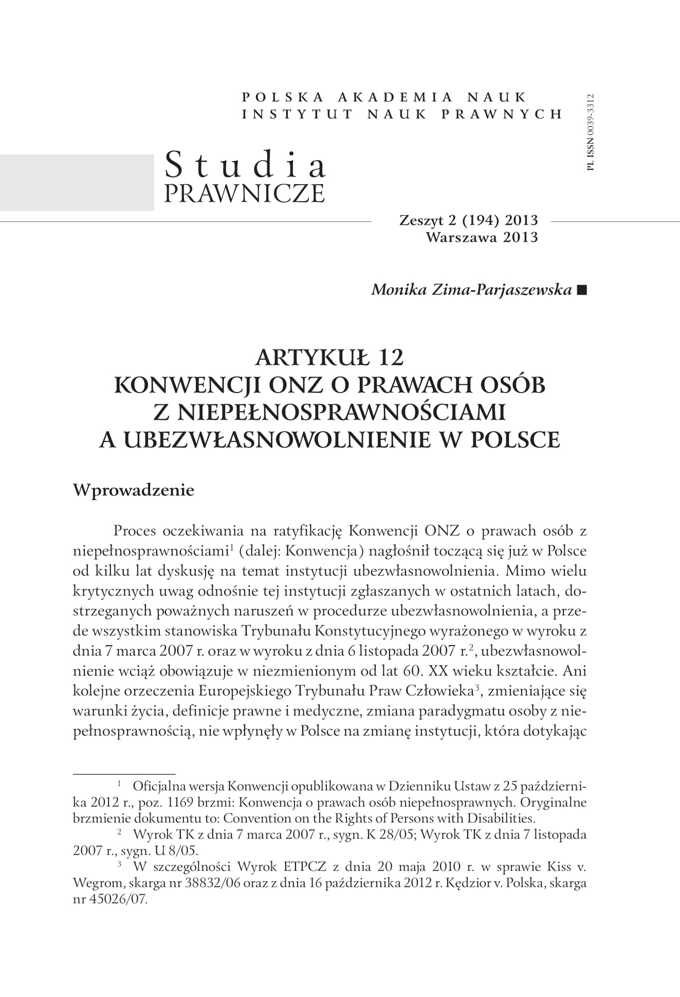 Proces oczekiwania na ratyfikację Konwencji ONZ o prawach osób z niepełnosprawnościami (dalej: Konwencja) nagłośnił toczącą się już w Polsce od kilku lat dyskusję na temat instytucji ubezwłasnowolnienia. Mimo wielu krytycznych uwag odnośnie tej instytucji zgłaszanych w ostatnich latach, dostrzeganych poważnych naruszeń w procedurze ubezwłasnowolnienia, a przede wszystkim stanowiska Trybunału Konstytucyjnego wyrażonego w wyroku z dnia 7 marca 2007 r. oraz w wyroku z dnia 6 listopada 2007 r., ubezwłasnowolnienie wciąż obowiązuje w niezmienionym od lat 60. XX wieku kształcie. Ani kolejne orzeczenia Europejskiego Trybunału Praw Człowieka, zmieniające się warunki życia, definicje prawne i medyczne, zmiana paradygmatu osoby z niepełnosprawnością, nie wpłynęły w Polsce na zmianę instytucji, która dotykając podstawowych wolności i praw człowieka, prowadzi do wykluczenia społecznego i prawnego coraz większej liczby osób. Mimo że w praktyce ubezwłasnowolnienie nie odpowiada na faktyczne potrzeby osób wymagających prawnego wsparcia w różnorodnych sytuacjach, nie uwzględnia różnych stanów ich funkcjonowania, odmiennych interesów, a przede wszystkim zaprzecza podmiotowości człowieka, jego prawa do samorealizacji i rozwoju, wciąż jest stosowane przez polskie sądy.