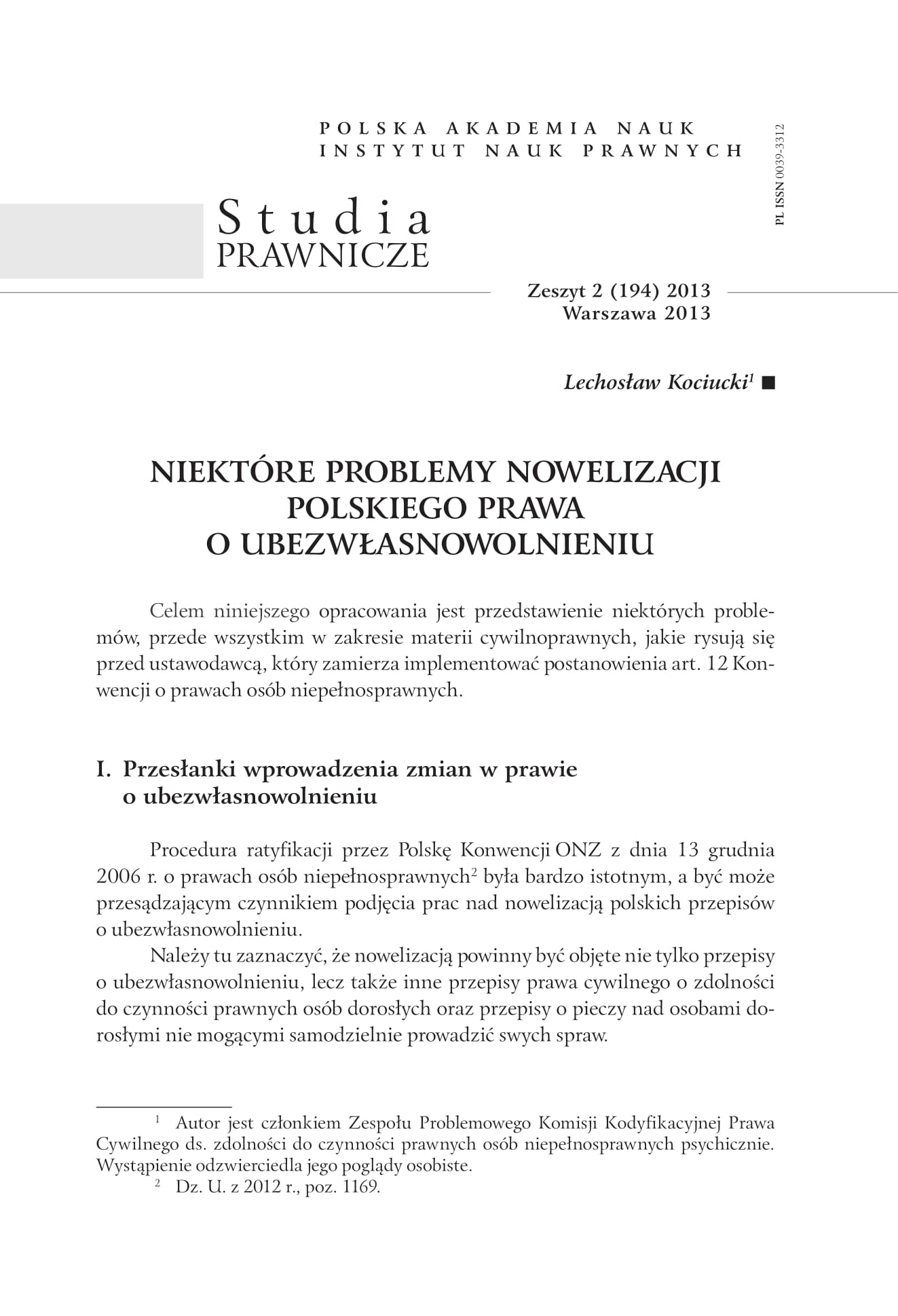 Celem niniejszego opracowania jest przedstawienie niektórych problemów, przede wszystkim w zakresie materii cywilnoprawnych, jakie rysują się przed ustawodawcą, który zamierza implementować postanowienia art. 12 Konwencji o prawach osób niepełnosprawnych.