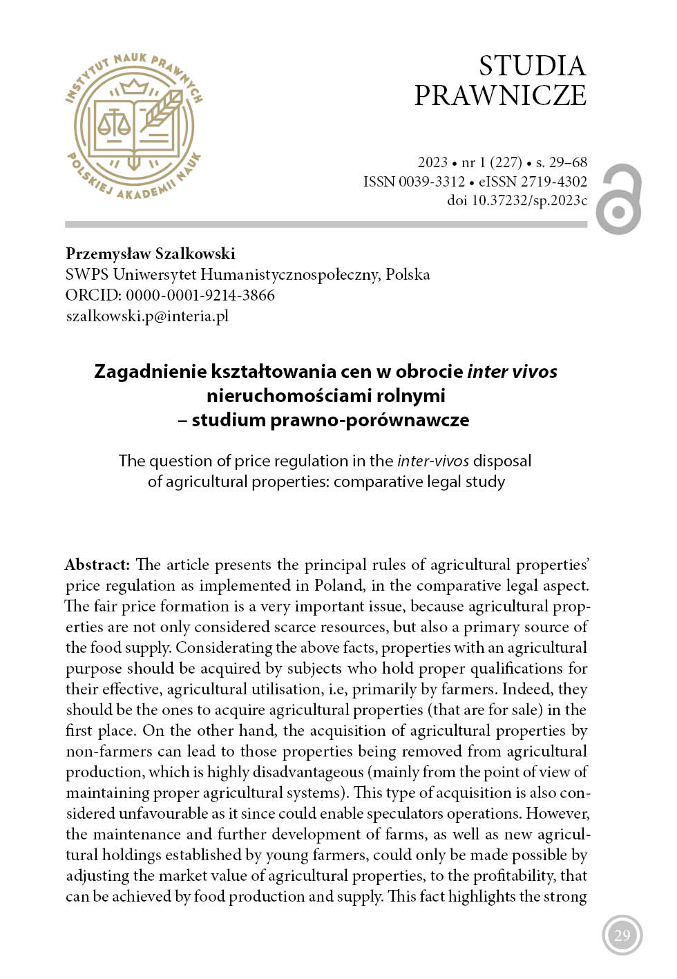 The study introduces three principal models that are implemented in western-european legal systems. Moreover, the legal regulations implemented in the field of price control by states such as Switzerland, Germany, Austria, France and England have been subject to analysis. Those regulations have been also used as a base to introduce polish regulations in the respective field. The scope of the article is to provide an answer to the question if the control of agricultural properties’ prices can be considered a common and intentional occurrence, as well as to determine if the polish regulations, that have been assumed in the Act on the structuring of the agrarian system, were rational, if they currently contribute to the stabilization of the market of agricultural properties and to what degree do they interfere with the constitutionally protected ownership right.