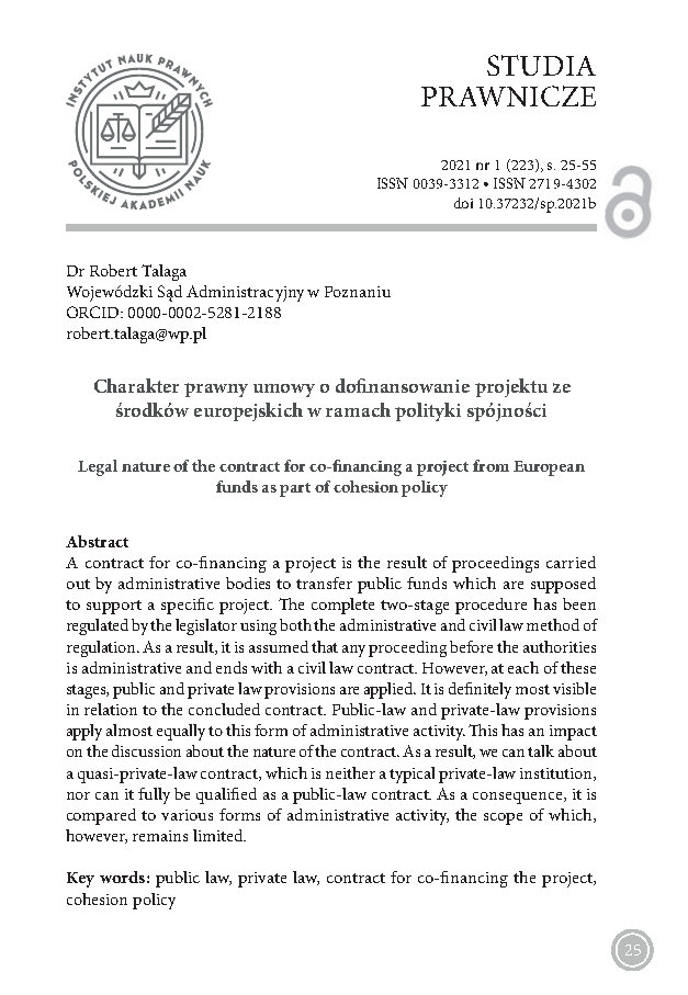 Charakter prawny umowy o dofinansowanie projektu ze środków europejskich w ramach polityki spójności: [Legal nature of the contract for co-financing a project from European funds as part of cohesion policy]. (2021). Studia Prawnicze The Legal Studies, 1 (223), 25-55. https://doi.org/10.37232/sp.2021b