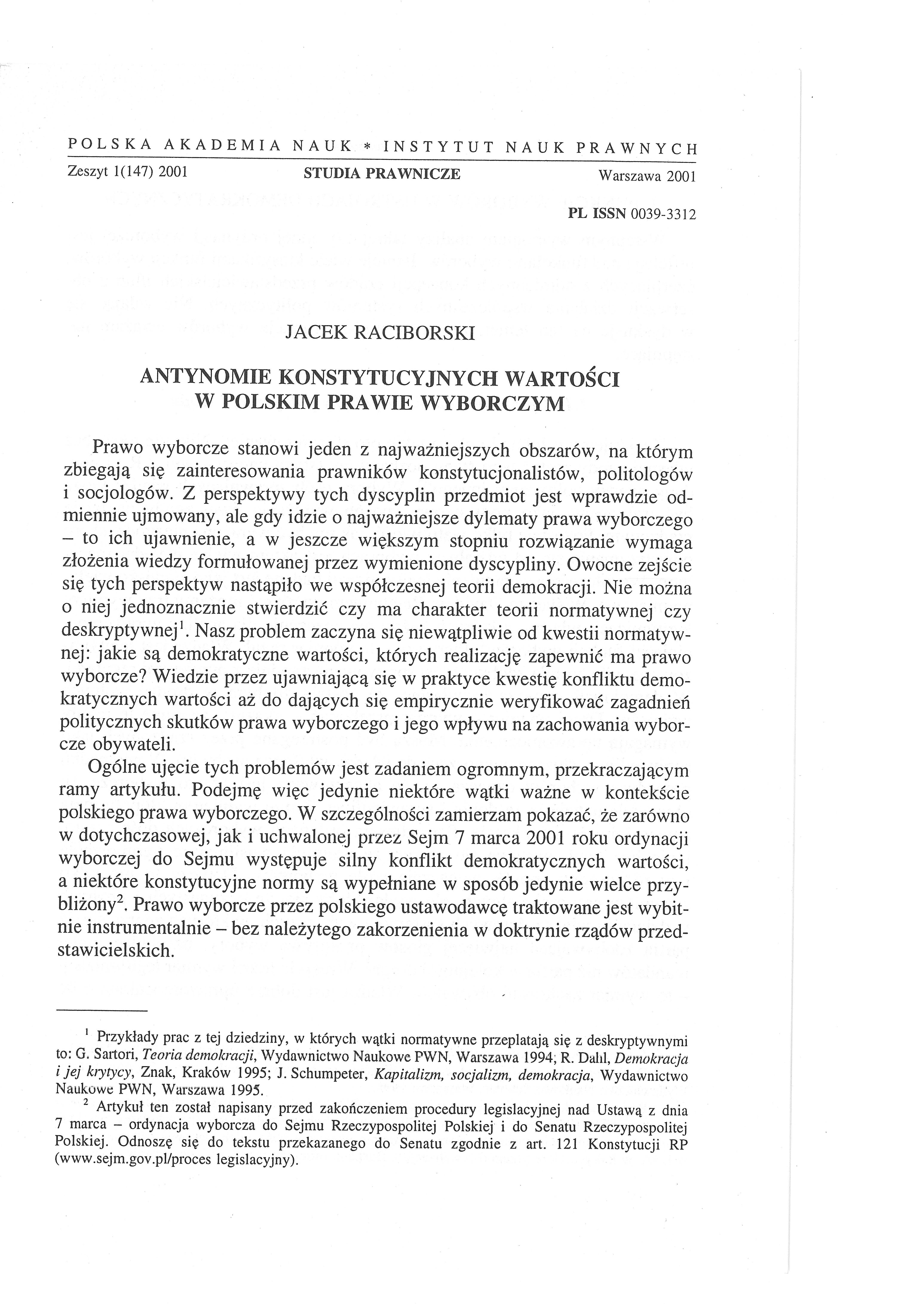 The electoral law is one of the most important areas where the interests of constitutional lawyers, political scientists and sociologists converge. From those disciplines’ perspective, the subject matter is admittedly approached differently, but when it comes to the most important dilemmas of electoral law, their disclosure and, to an even greater extent, resolution requires the assembly of knowledge formulated by the aforementioned disciplines. The contemporary democratic theory provides for a fruitful confluence of these perspectives. It is not possible to clearly state whether it is a normative or a descriptive theory. Our problem undoubtedly begins with a normative question: what are the democratic values that the electoral law is supposed to ensure? It leads through the practical issue of the conflict of democratic values to the empirically verifiable issues of the political effects of electoral law and its impact on citizens' voting behaviour. The general coverage of these problems is a formidable task which exceeds the scope of the article. The author only picks up on some of the themes that are important in the context of the Polish electoral law. In particular, he shows that there is a strong conflict of democratic values in both the existing parliamentary election system and the one passed by the Sejm on 7 March 2001, and that some constitutional norms are only fulfilled in a very rough manner. The Polish legislator treats the electoral law extremely instrumentally - without proper rooting in the doctrine of representative government.